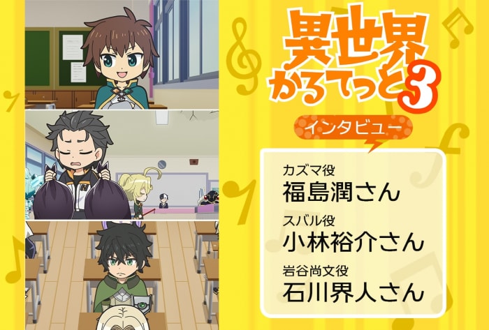 『異世界かるてっと3』カズマ役・福島潤さん×スバル役・小林裕介さん×岩谷尚文役・石川界人さんメールインタビュー|『このすば』『リゼロ』『盾の勇者』の主人公キャスト陣に、お互いのキャラクターの印象や羨ましいところを伺ってみた!