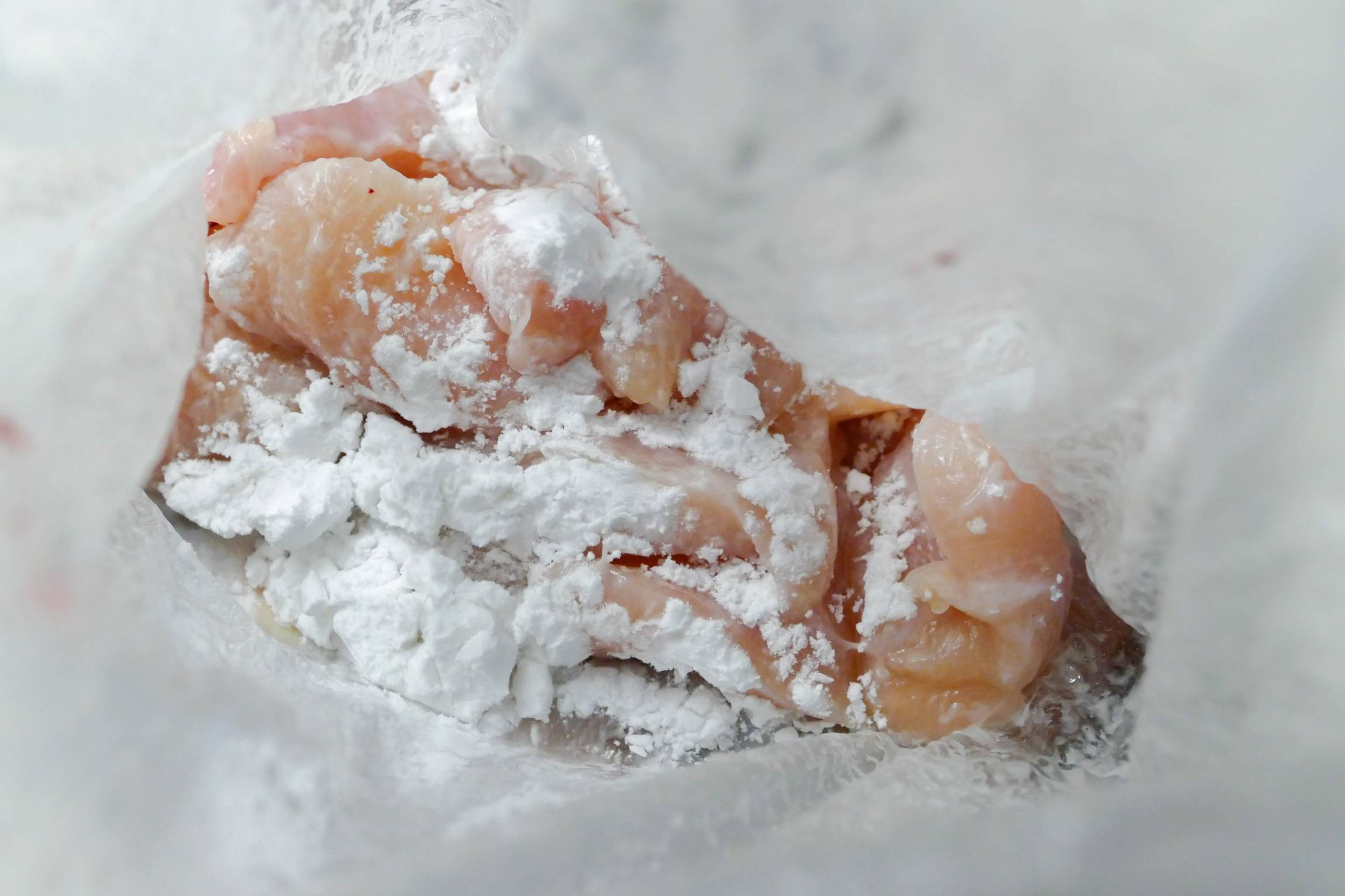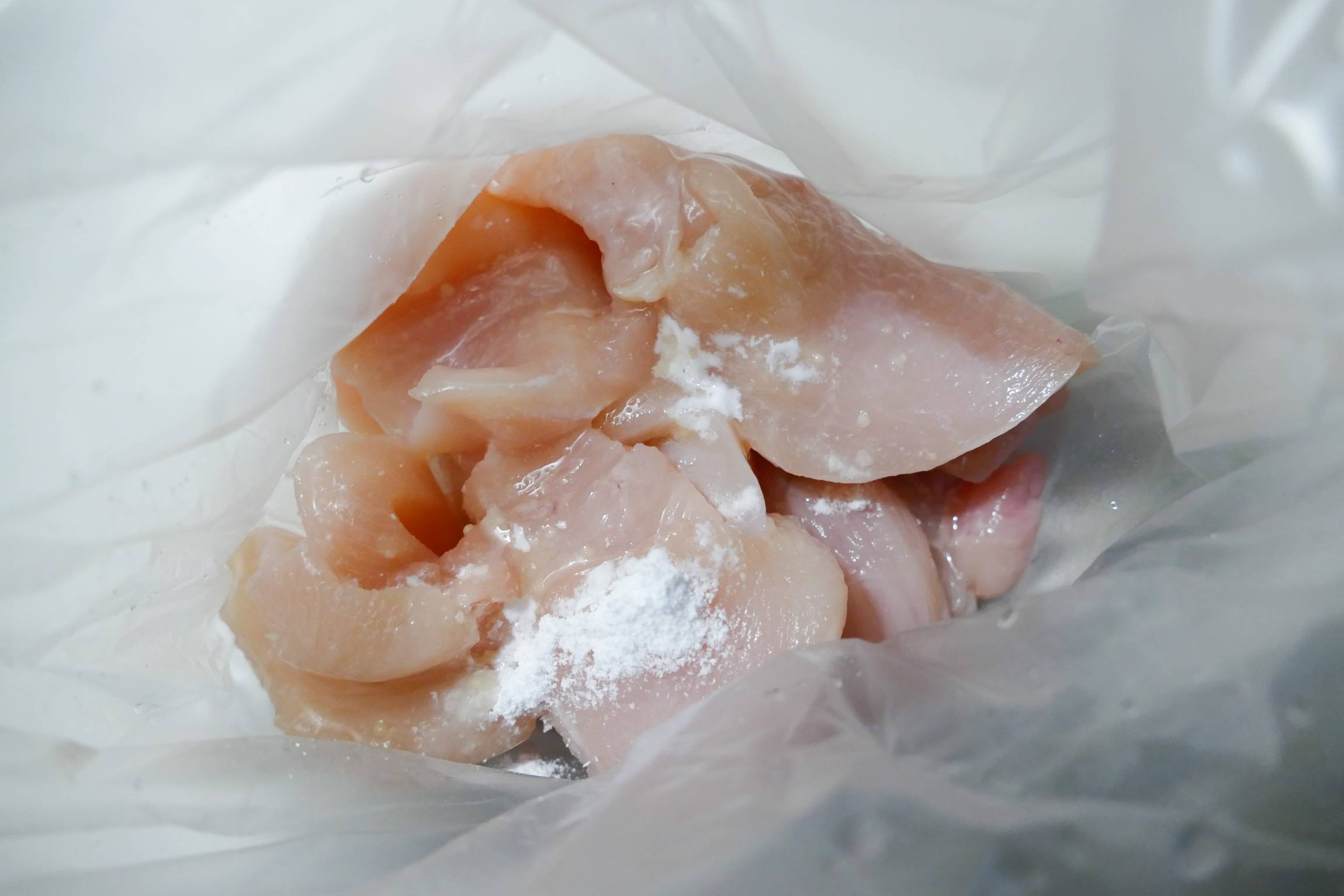 保水性のある砂糖、酒、片栗粉を揉み込んでパサつくのを防ぐ