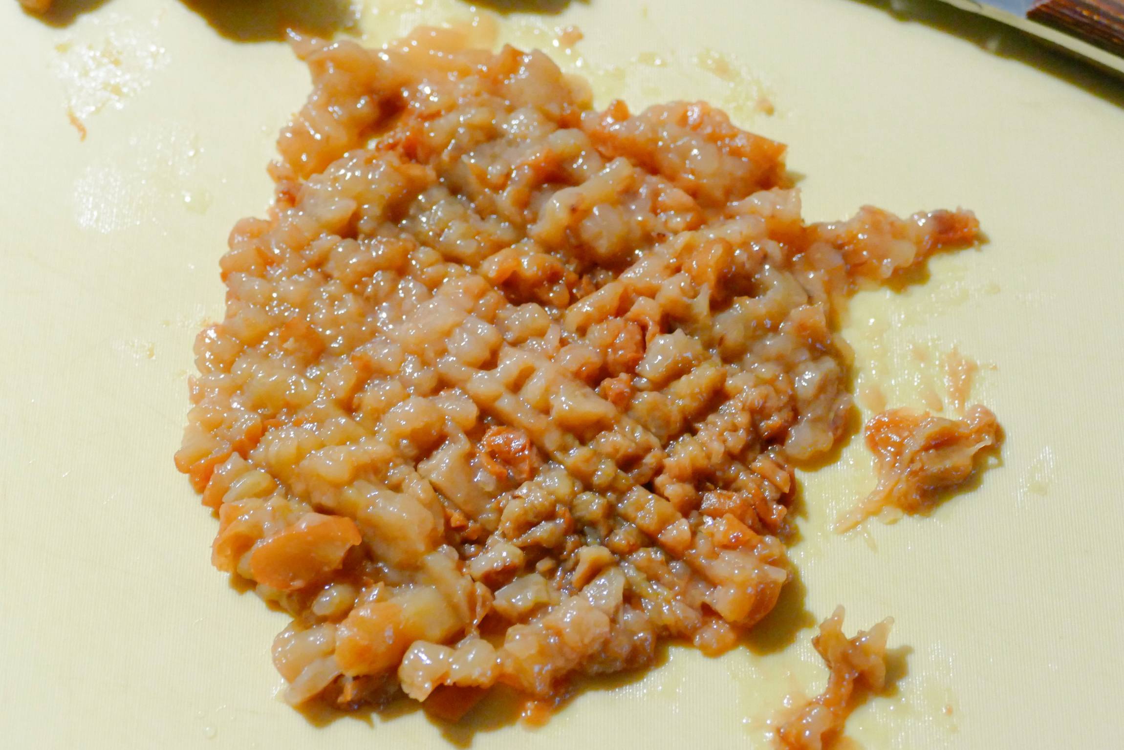 梅干しの種を取り除き、包丁で叩きます。小さめの梅干しは4~5個、大きめの梅干しは3個が適量です。