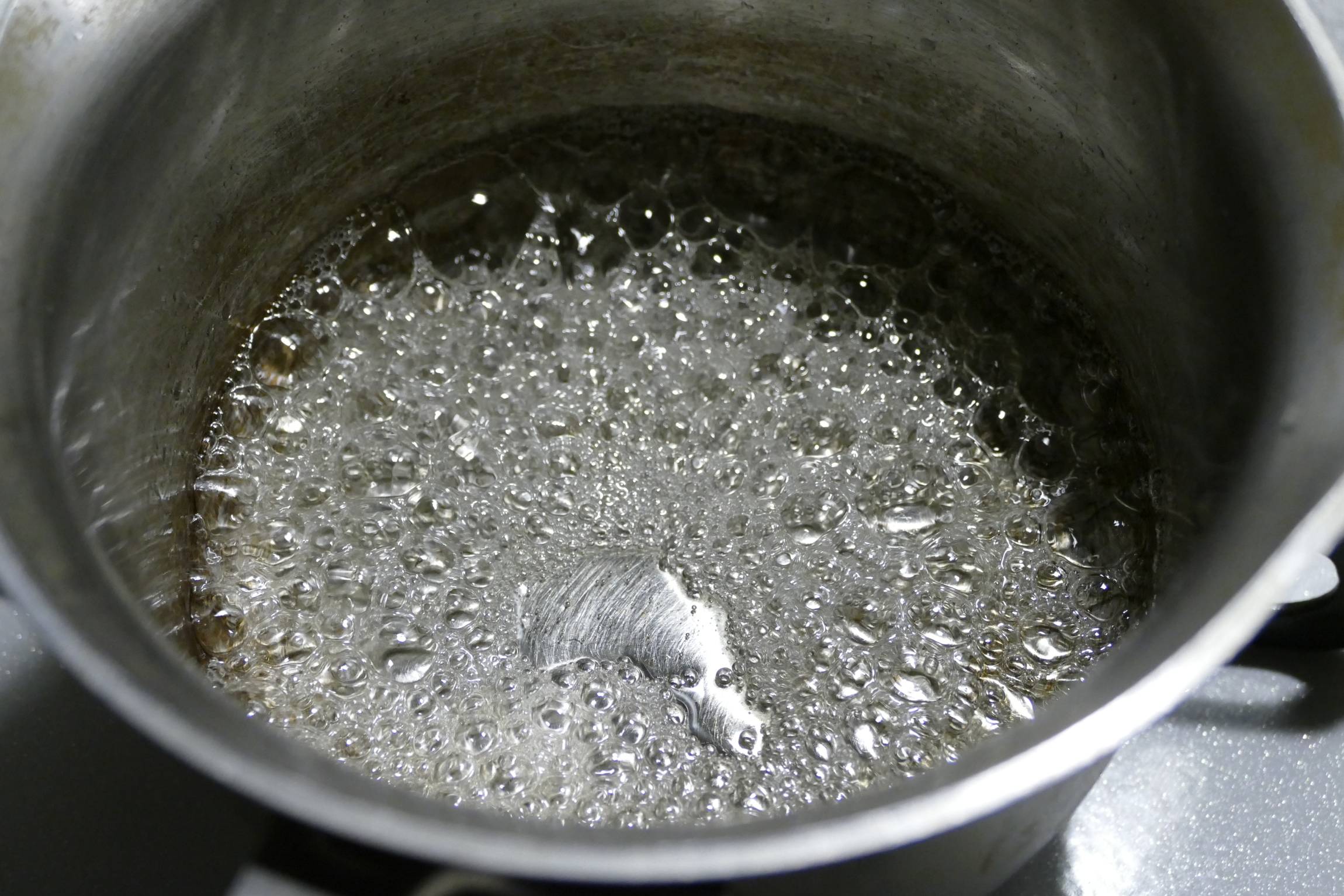 小鍋にみりんを入れて火にかけ、しっかり煮立たせたら火を止めます。
