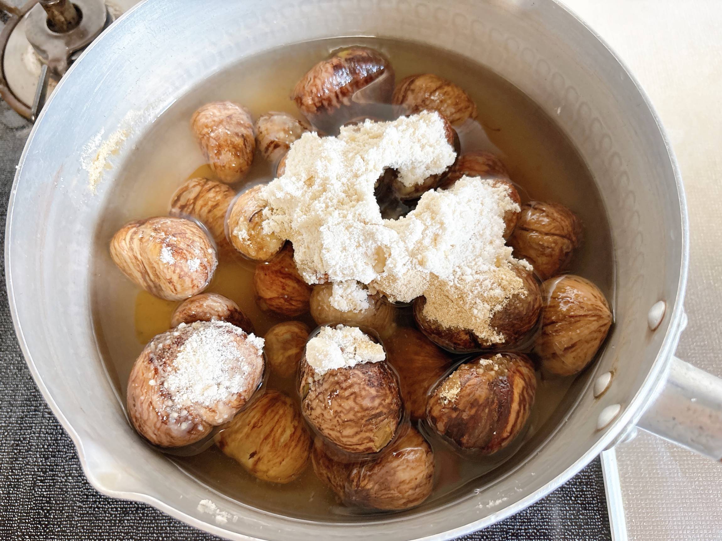 鍋に栗と、半量である200gのきび砂糖、ひたひたの水を入れて中火にかけます。沸騰したら弱火にし10分ほど煮ます。砂糖は一気に入れず2〜3回に分けて加えると味が染みやすいです。