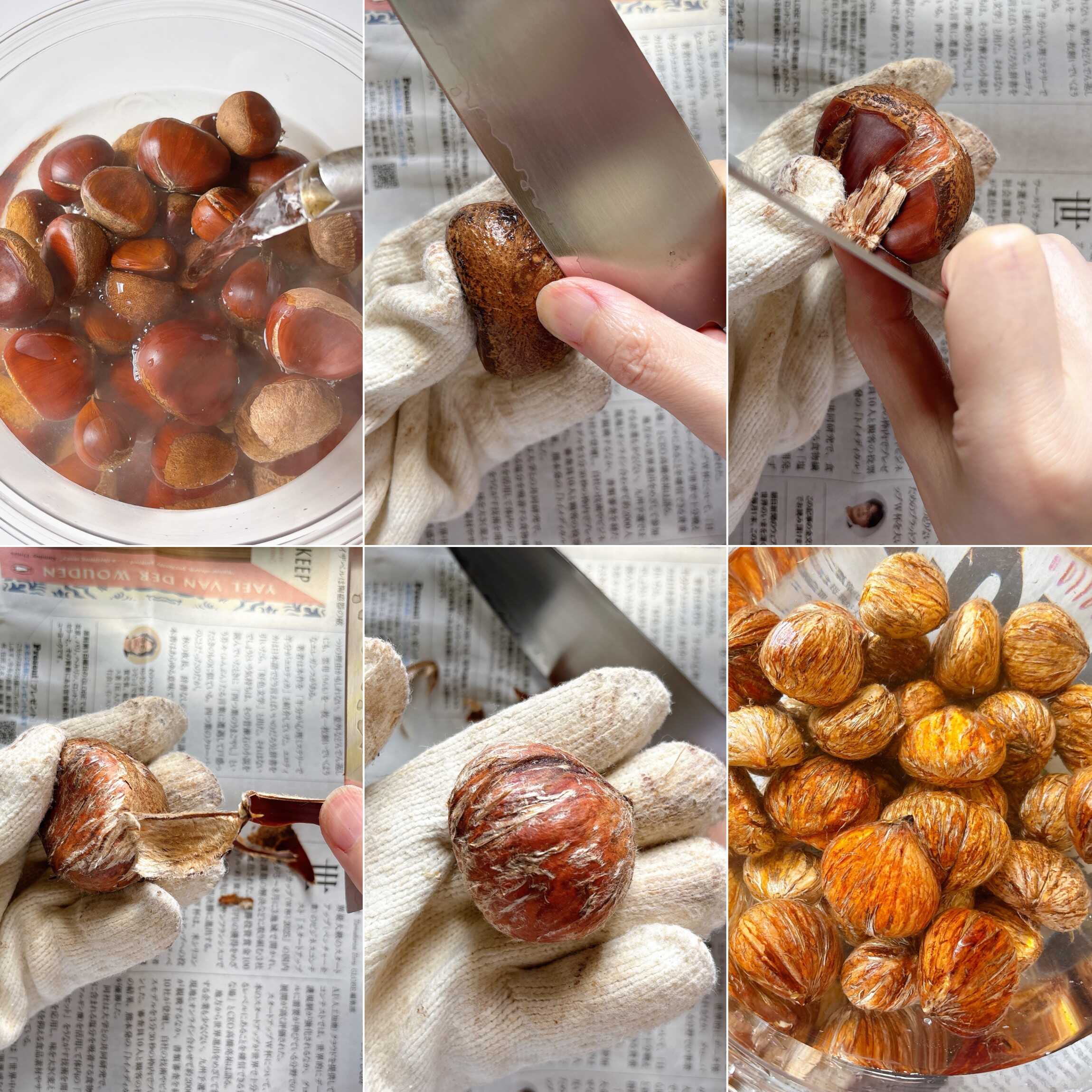6. 鬼皮を剥いた栗は乾燥すると割れやすいため、水に浸しておく