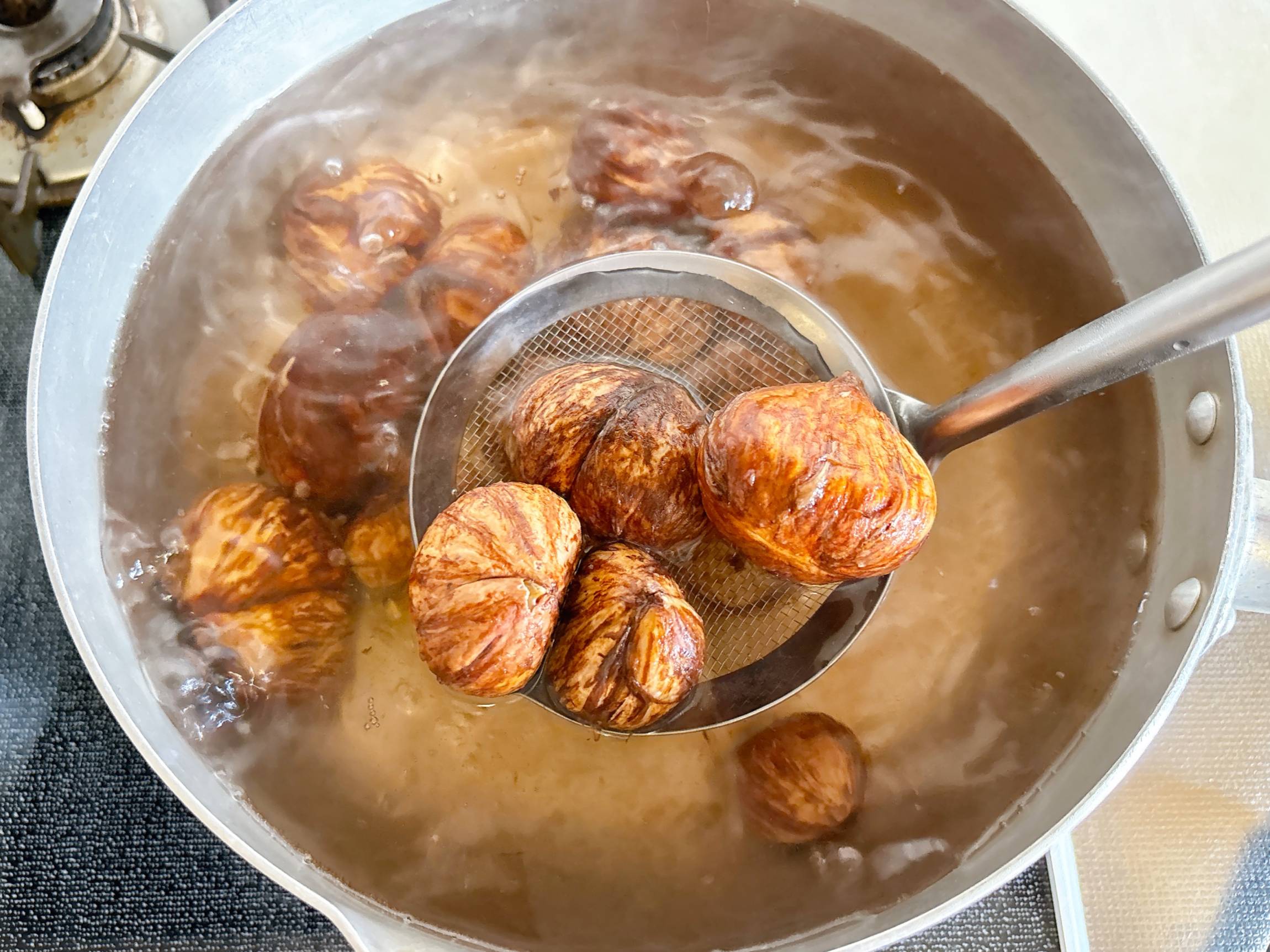また、栗は弱火でコトコト静かにゆでること。火加減に注意してぐらぐらと煮立てないようにしてください。さらに水にさらしたり流水で洗ったりすると栗が縮んで渋皮が破れることがあります。栗をゆでた湯を捨てて入れ替える際、別の鍋やポットで湯を沸かしておくのも大きなポイントです。