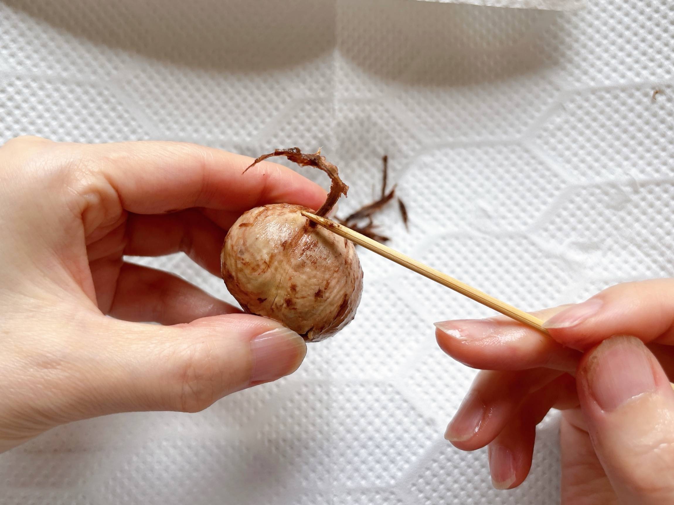 栗の筋に沿って入っている太い繊維も竹串でやさしく外します。栗によって外れやすいものとなかなか取り除けないものがあります。無理に外そうとせず、湯に戻しておくと繊維が浮かんで外しやすくなりますよ。
