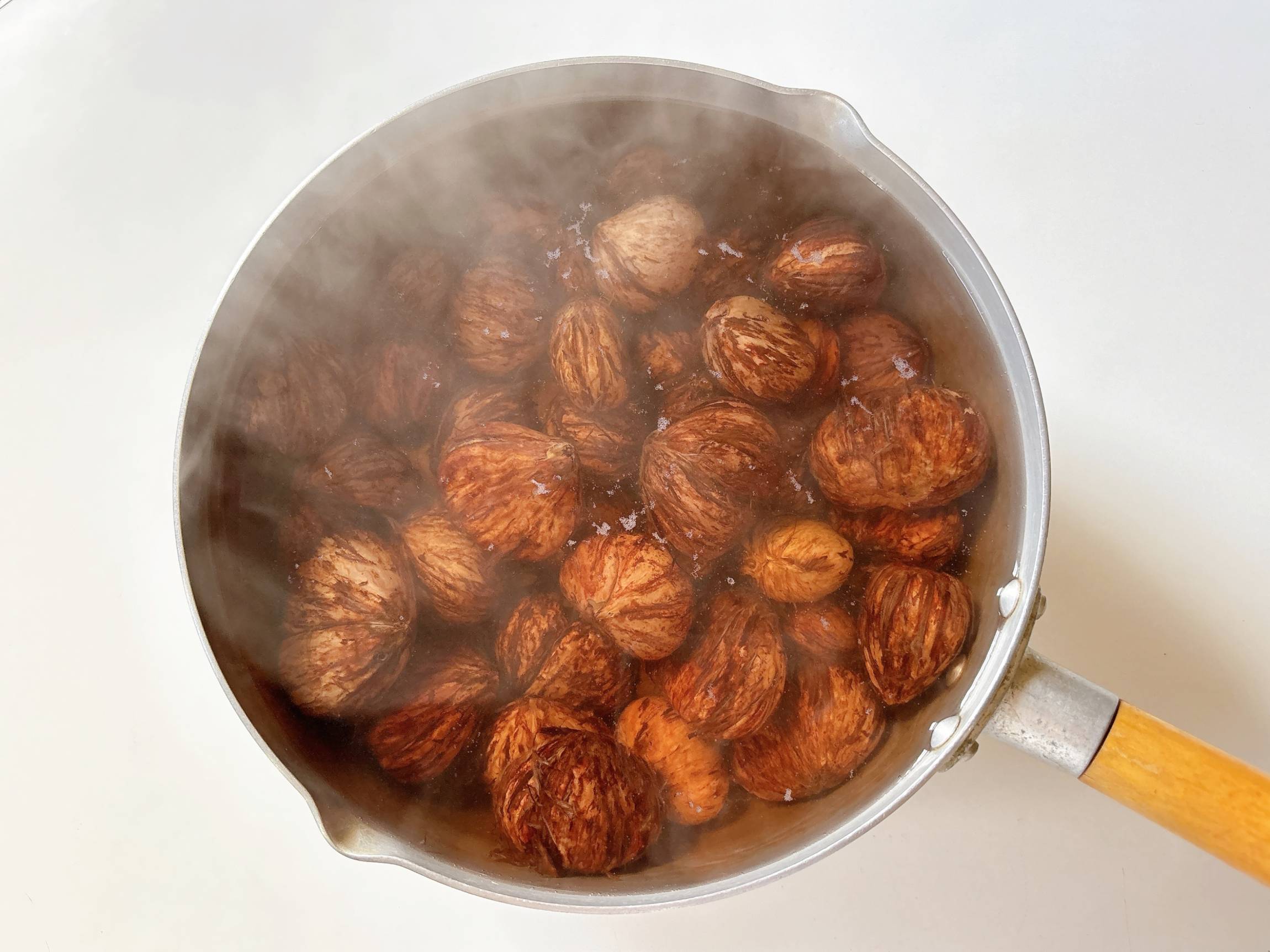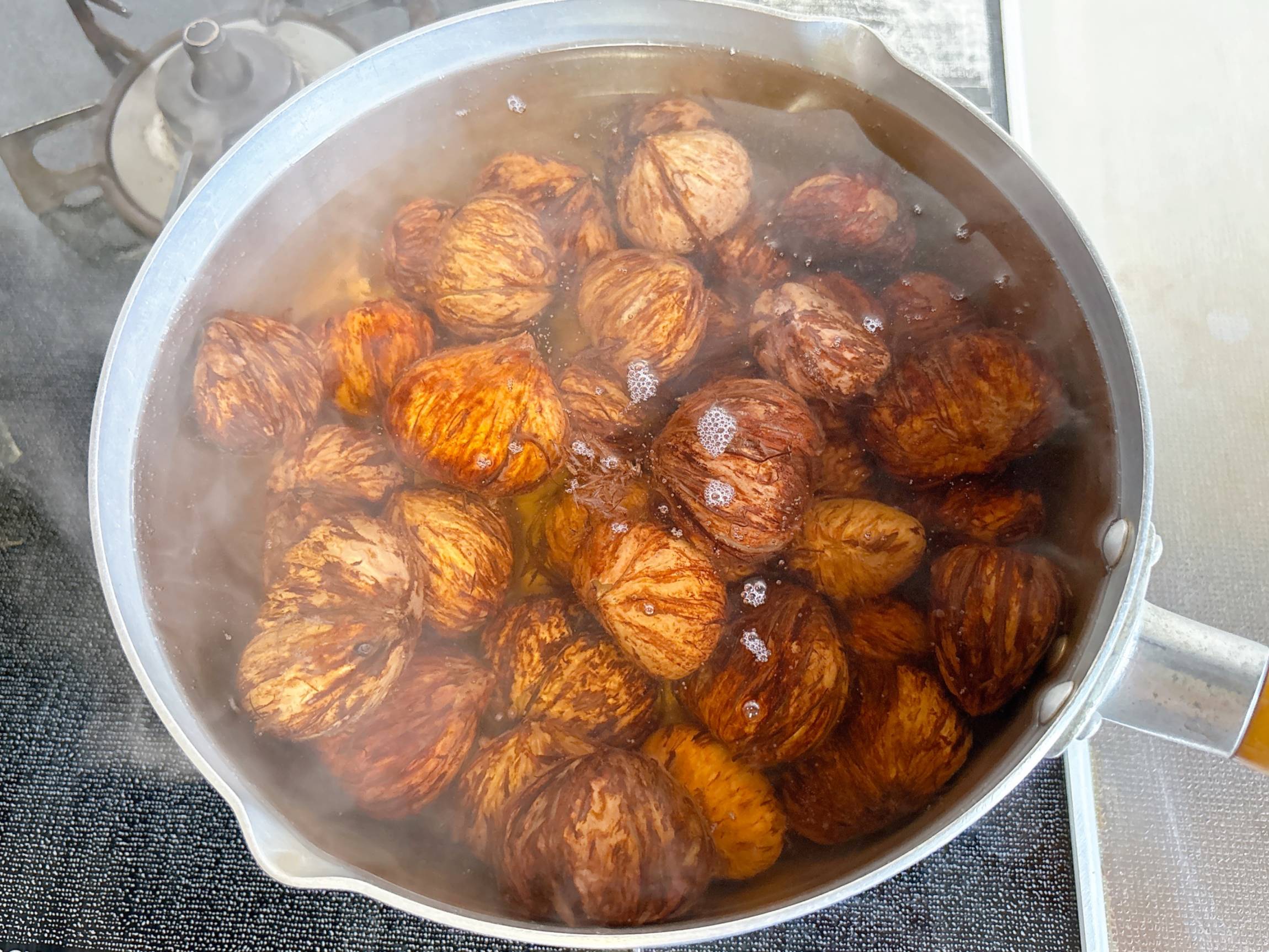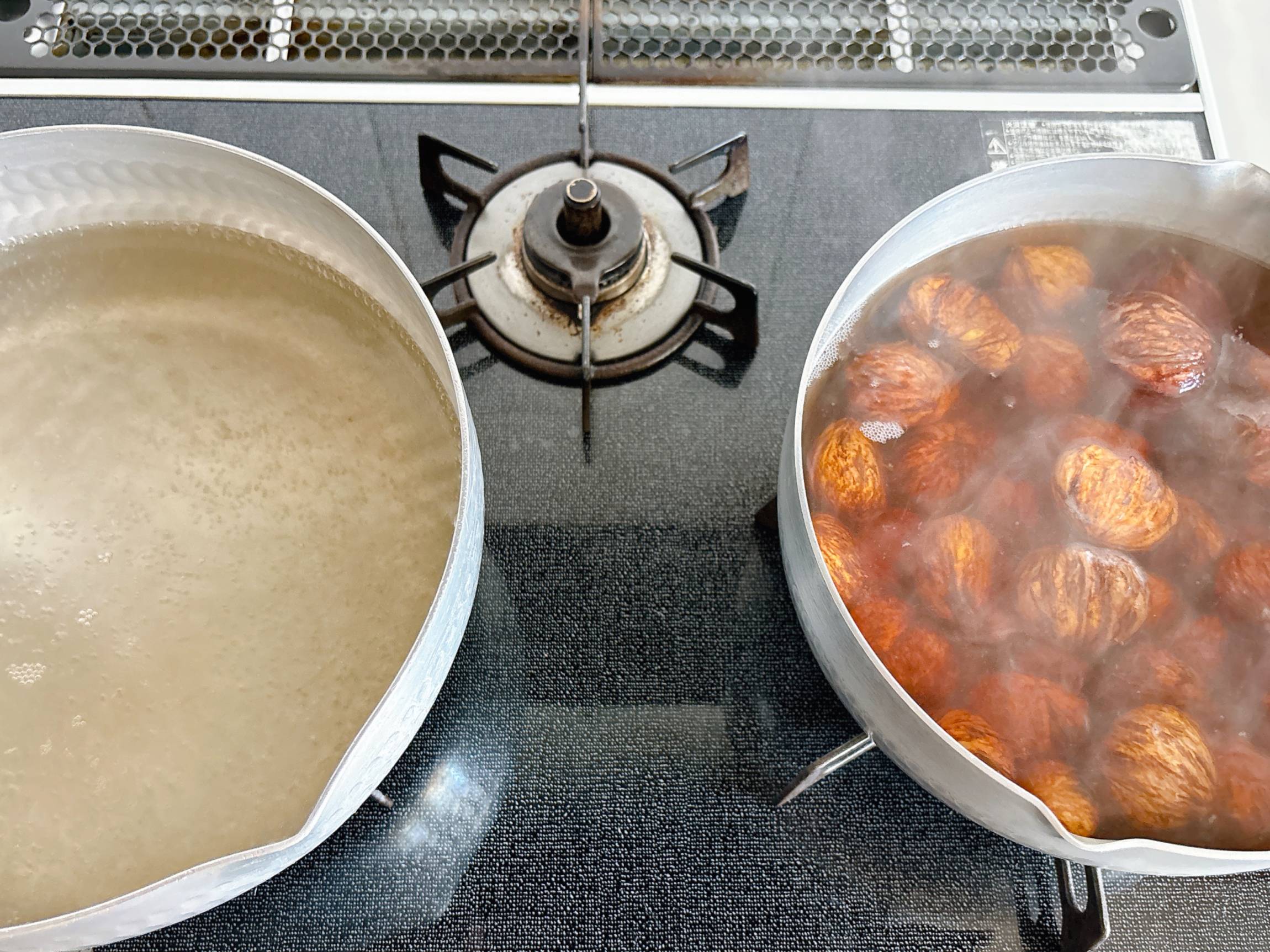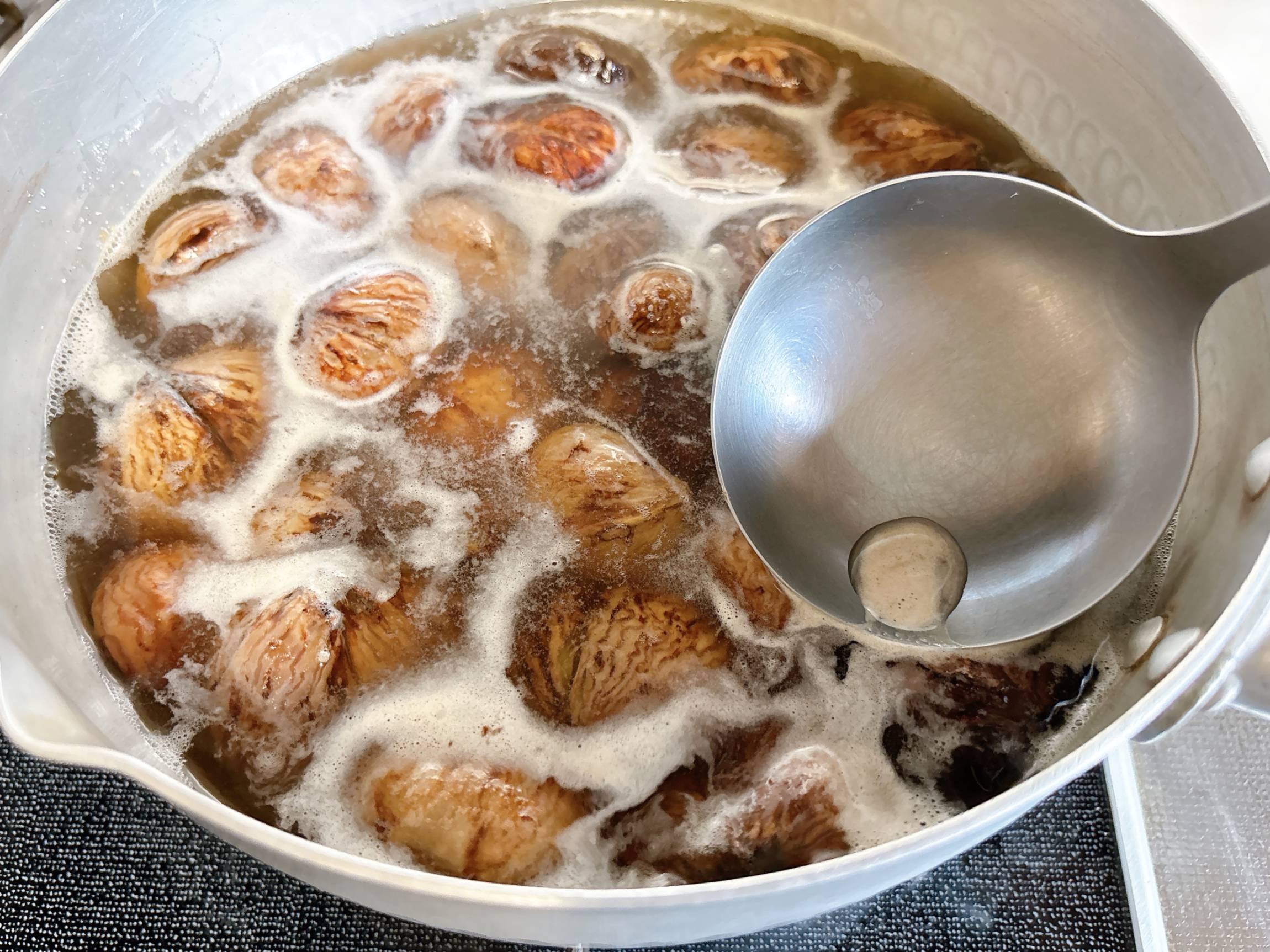 今回は重曹を使わないで作るため、5〜6回ゆでこぼしてしっかりとアク抜きをするのがポイント。湯を入れ替える際も、渋皮が破れないように丁寧に調理するのが大切です。