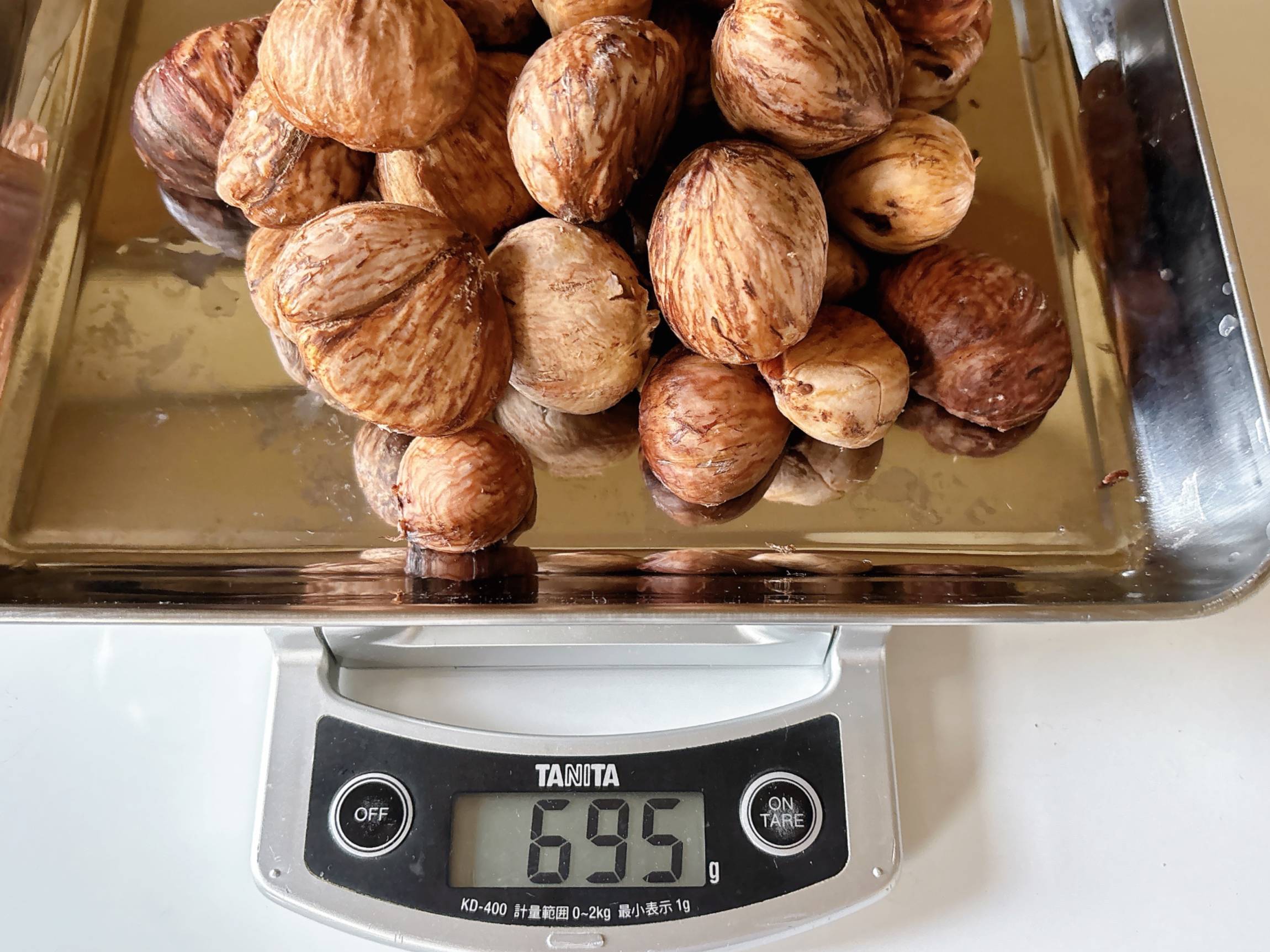 下ごしらえをした栗を計量し、その50〜60%のきび砂糖を用意します。今回は695gだったので、その約60%の400g準備しました。ここで、渋皮が大きく剥がれた栗は煮崩れしてしまうおそれがあるので取り除いておきます。