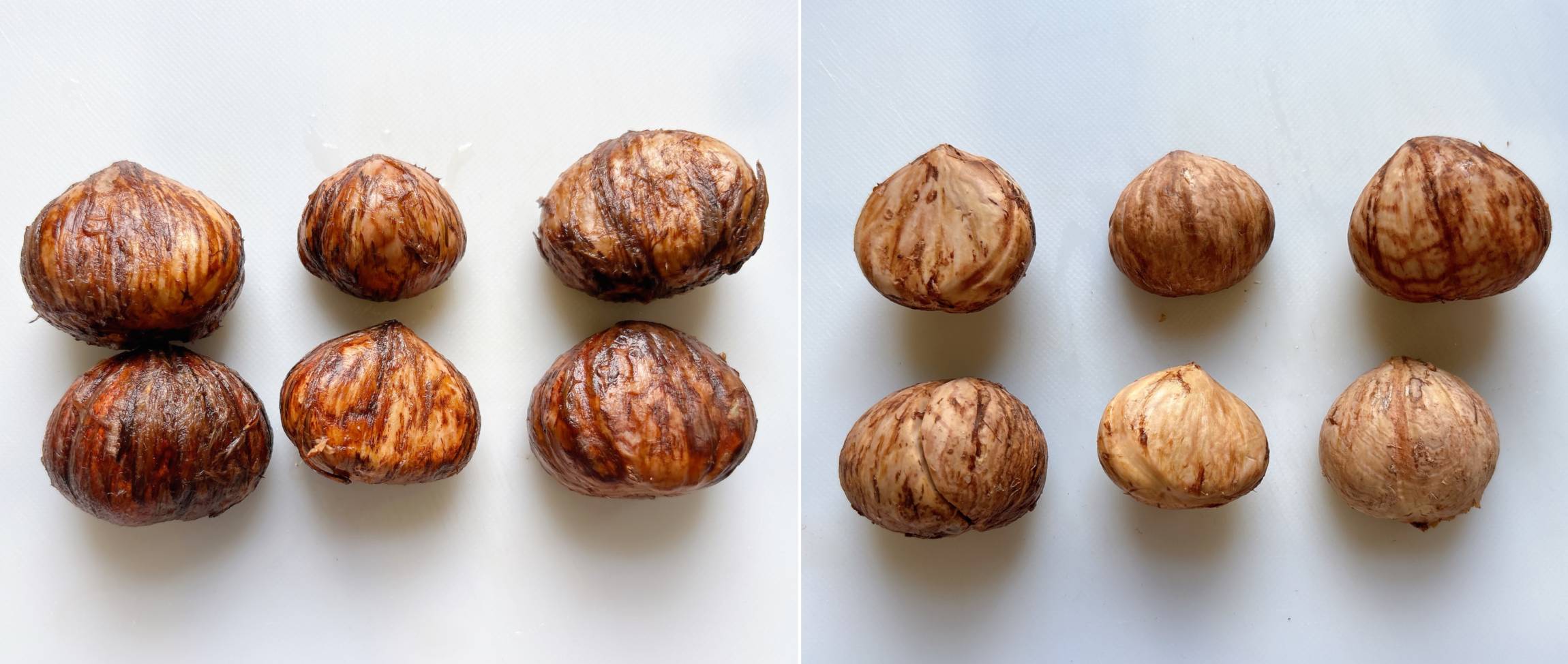 こげ茶色だった栗は、きれいに繊維を取り除くと薄い栗色になり模様が浮き上がります。