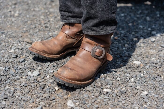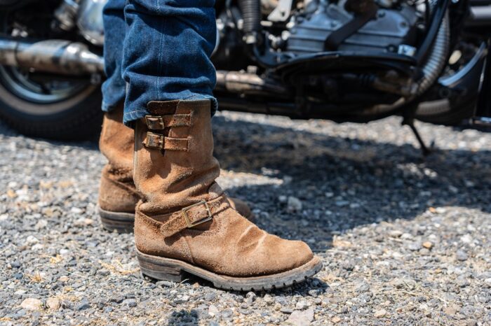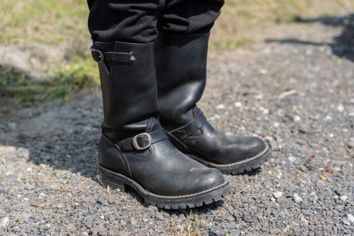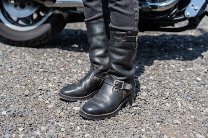 アーリーショベルのチョッパーを愛機とする戸髙さんは、ウエスコジャパンのクラフトマン。足元は、ラフアウトのモリソンをベースに、ラウンドトゥやボスのロングストラップなど、こだわりを詰め込んだ一足。