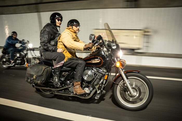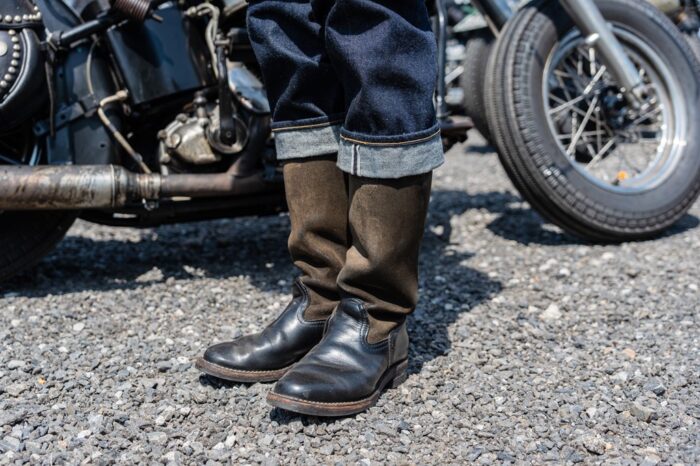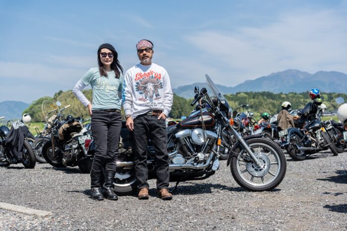 シルバージュエリー界の重鎮、「リンチシルバースミス」の矢野達也さんは奥様とFタンデムで参加。達也さんの足元はリンチシルバースミス×ウエスコの3rdコラボモデル。奥様は細めなパンツをブーツインした女性らしいボスの履きこなし。