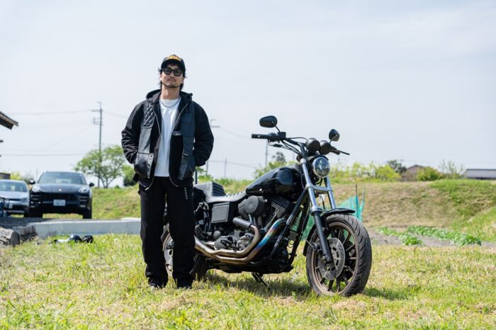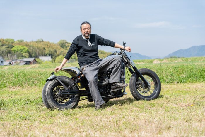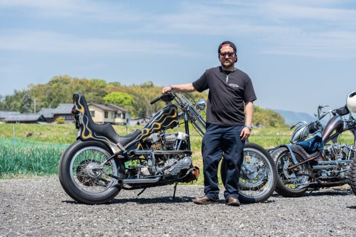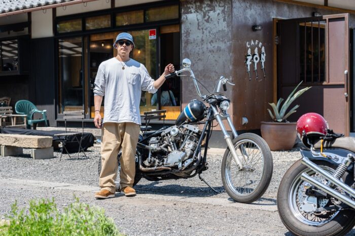 今回のラリーの目的地となった「ZON」のビルダー吉澤さんとダイナのフルカスタム。愛用ブーツはホースハイドを採用する限定ジョブマスター。何度もソールを張り替えて、仕事もバイクもタウンユースにも使うほどお気に入りの一足だ。