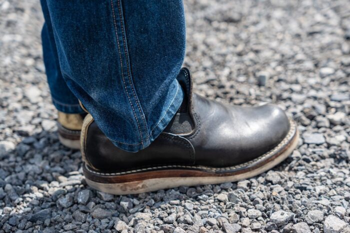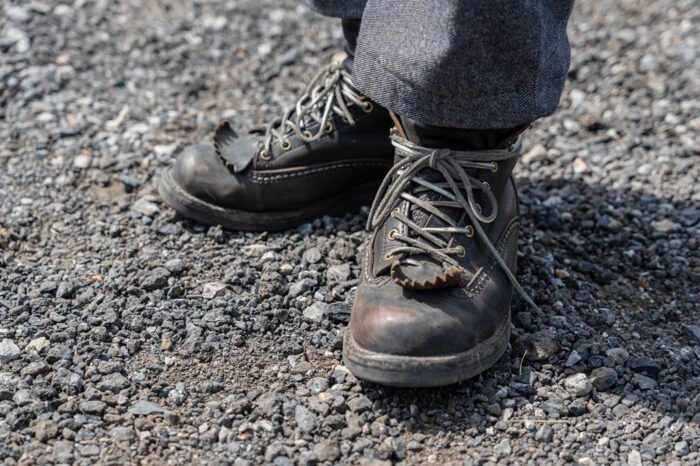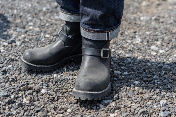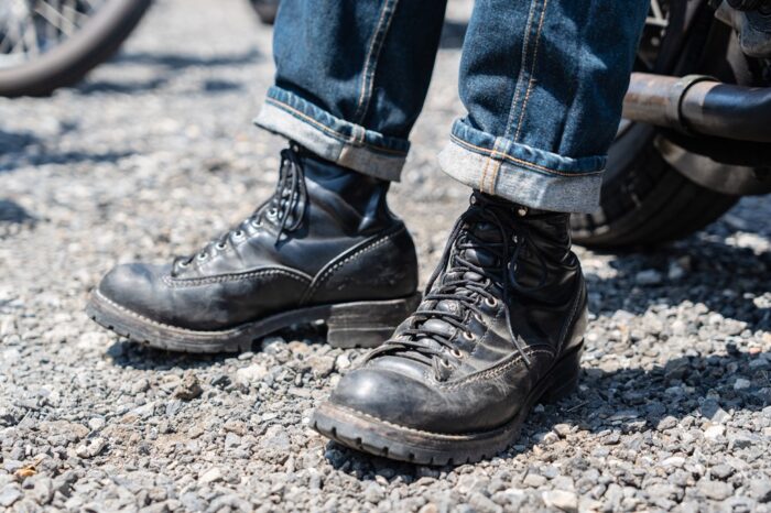 ラングリッツのキャスケードに太めのデニム、そして足元はコンビレザーのモーターサイクルパトロール。まさにオレゴン発のクラシカルなバイクスタイルのお手本。シャフトのラフアウトのエイジングが抜群の雰囲気だ。