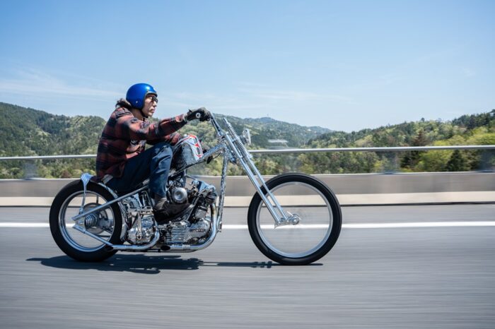 タンクからハイバックのリアフェンダーまで一体ボディのスキニーな車体に、S&Sナックルを搭載するチョッパーは「ZON」が製作したカスタム。バイクに乗るときのブーツはブラウンレザーのボスがフェイバリット。