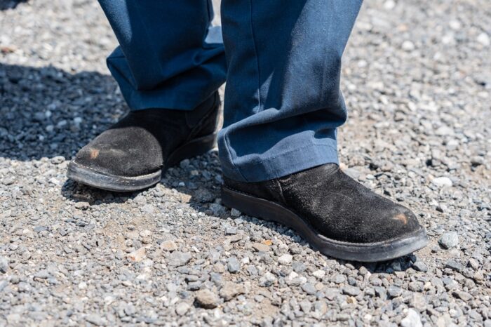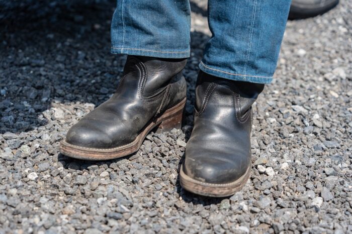 パンショベルのサバイバーで参加した木原さん。刺し子のシャツはシップジョン、愛用ブーツはローカットのロメオ。イタリアンホースハイドを採用し、バックステイを白にするなど個性的なカスタムで仕上げられている。