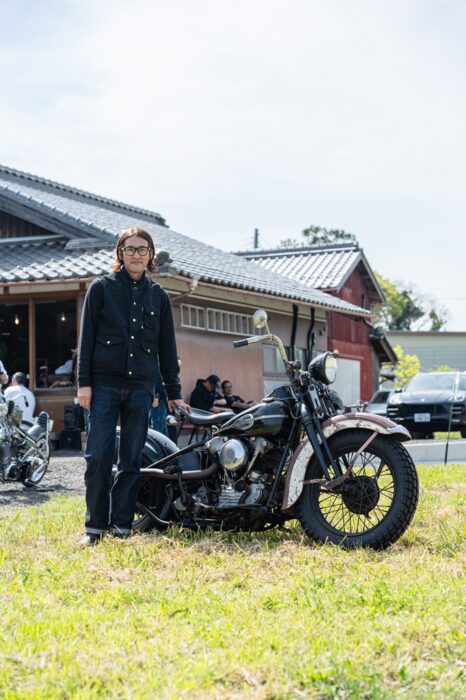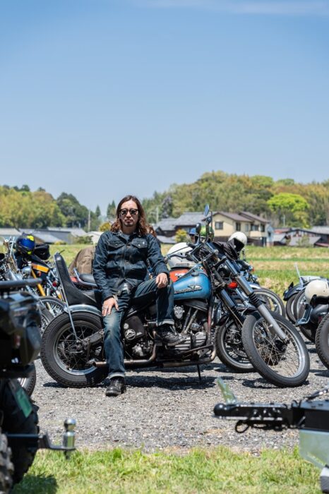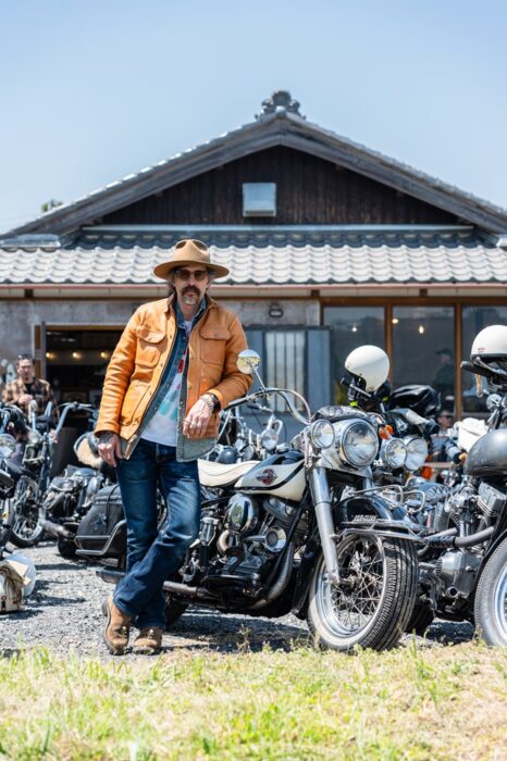 長年走り続けるハイドラグライドのチョッパーで参加したウエスコ・ジャパンディレクターを務める河北さん。アウターはシップジョンのランブリンジャケット、ブーツはクォーターに艶やかなコードバンを採用するリミテッドモデルだ。