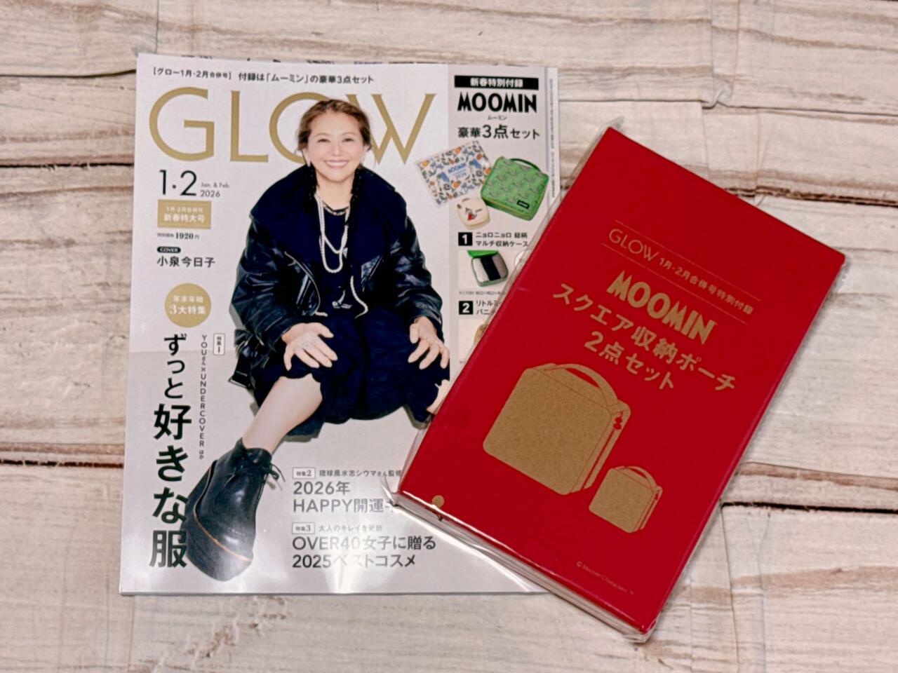 雑誌『GLOW(グロー)』2026年1月・2月合併号には、MOOMIN(ムーミン)の「収納マルチポーチ2種」と「2026年カレンダー」が付録としてついてきます。