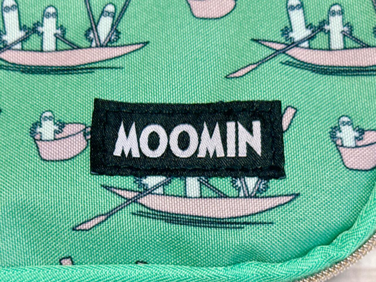 カラーはグリーン。ピンクのボートに乗ったニョロニョロの総柄デザインがとってもキュート♪前面蓋部分には、「MOOMIN」のブラックカラーの織りタグ付きなのもうれしいポイントです。