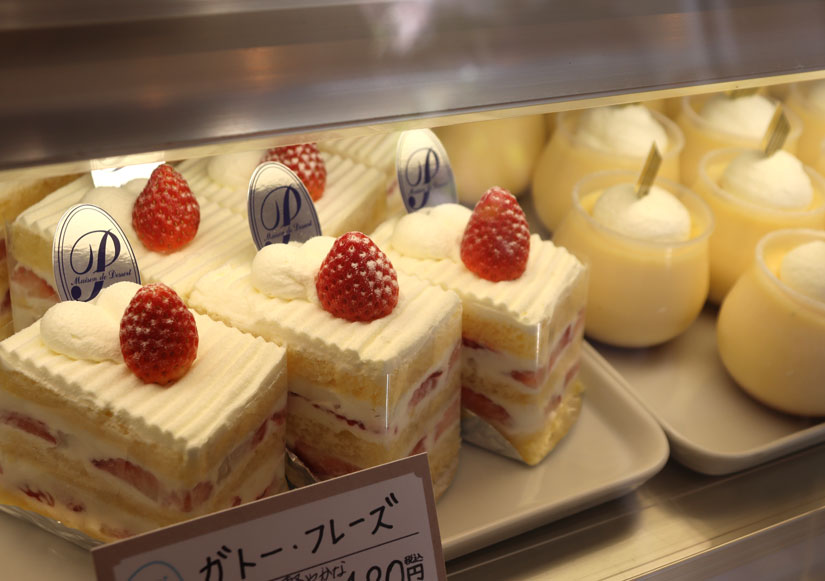 お店の看板商品は、雲のようなフワフワ食感が特徴の白いシフォンケーキ「雲のシフォン」。店内のショーケースには、諏訪地域で育てられたイチゴを使った「ショートケーキ」(480円)や、タヒチ産の香り高いバニラを使用したカスタードがたっぷり詰まった「シュークリーム」(300円)といった生ケーキがならび、商品棚には食感や風味の良さにこだわった焼菓子がそろいます。