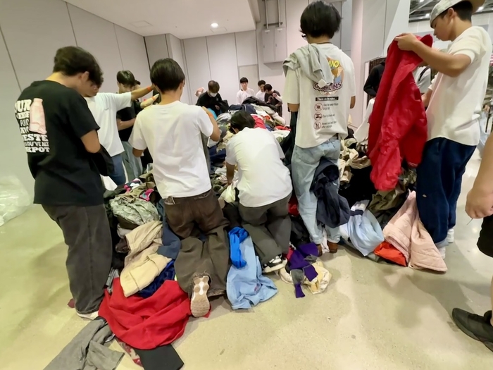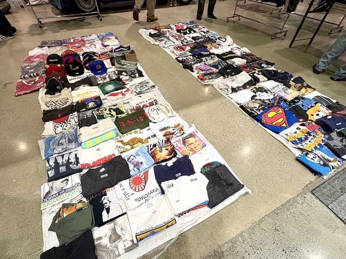 買い物を終えてホクホクしていると、あるブースから上がった「ただ今より全品300円でーす!」の声を合図に、わっと近くの人が動いた。人の流れに乗って、ブルーシート上に積み上げられた古着の山に突進してみる。古着のいいモノ探しをすることを「DIGる(掘る)」と表現するが、それはまさに「掘る」としか言いようのない体験だった。