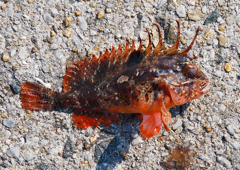 一見、小型のカサゴのように思えますが、ヒレに毒を備えているハオコゼです。刺されると腫れ上がり、しばらくは猛烈に痛みます。決して素手では触らないようにしましょう