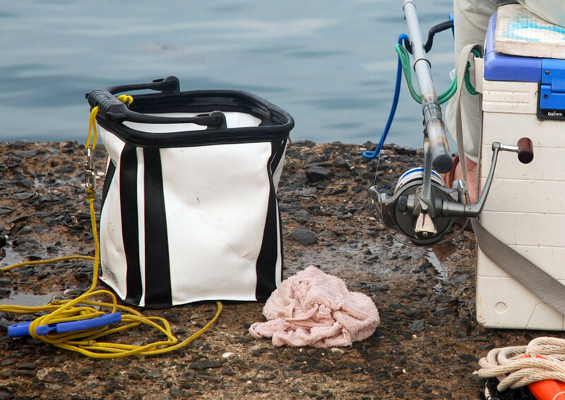 まず、竿はコンパクトロッド、シーバスロッド、投げ竿、万能竿などが使えます。リールはあまり大きくないスピニングリール(2500~3000番)。それにクーラーボックス、手拭きタオル、水汲みバケツというのが最低限の道具です。もちろん、仕掛に関わる小物は別です。根掛かりに備えてオモリやハリ、ハリスは多めに準備しておくことをおススメします。