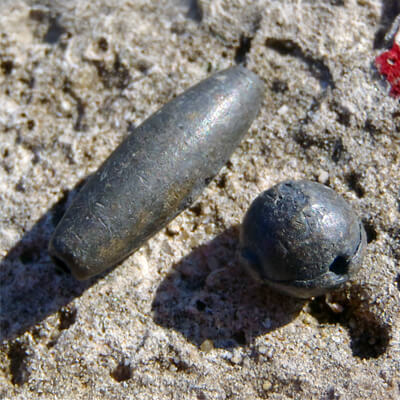 道糸の先にオモリ5~10号を通すというのがチョイ投げの基本です。左がナツメオモリ、右は丸オモリで、どちらも中通しタイプです
