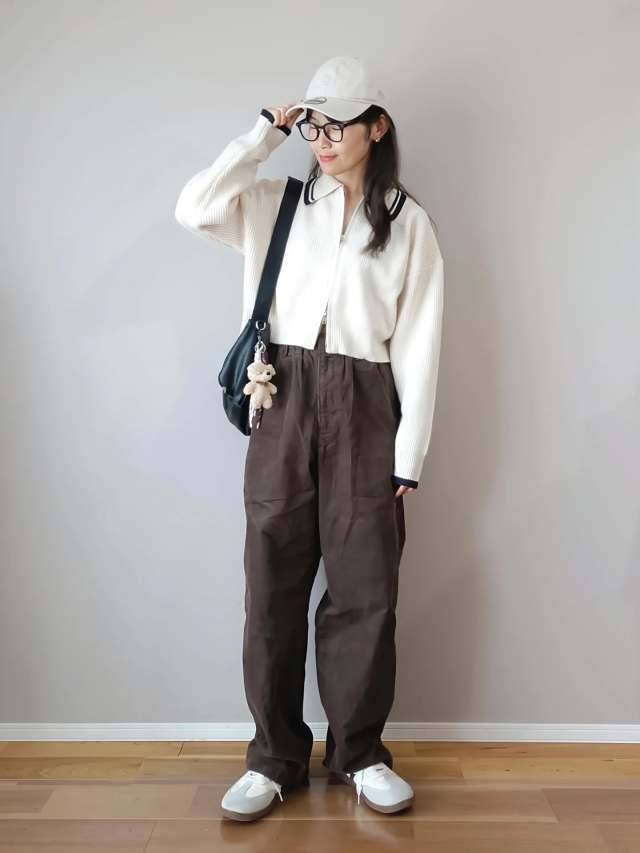白カーディガンとブラウンパンツの組み合わせは、大人っぽいコーデに仕上がるのも嬉しいですよね♪