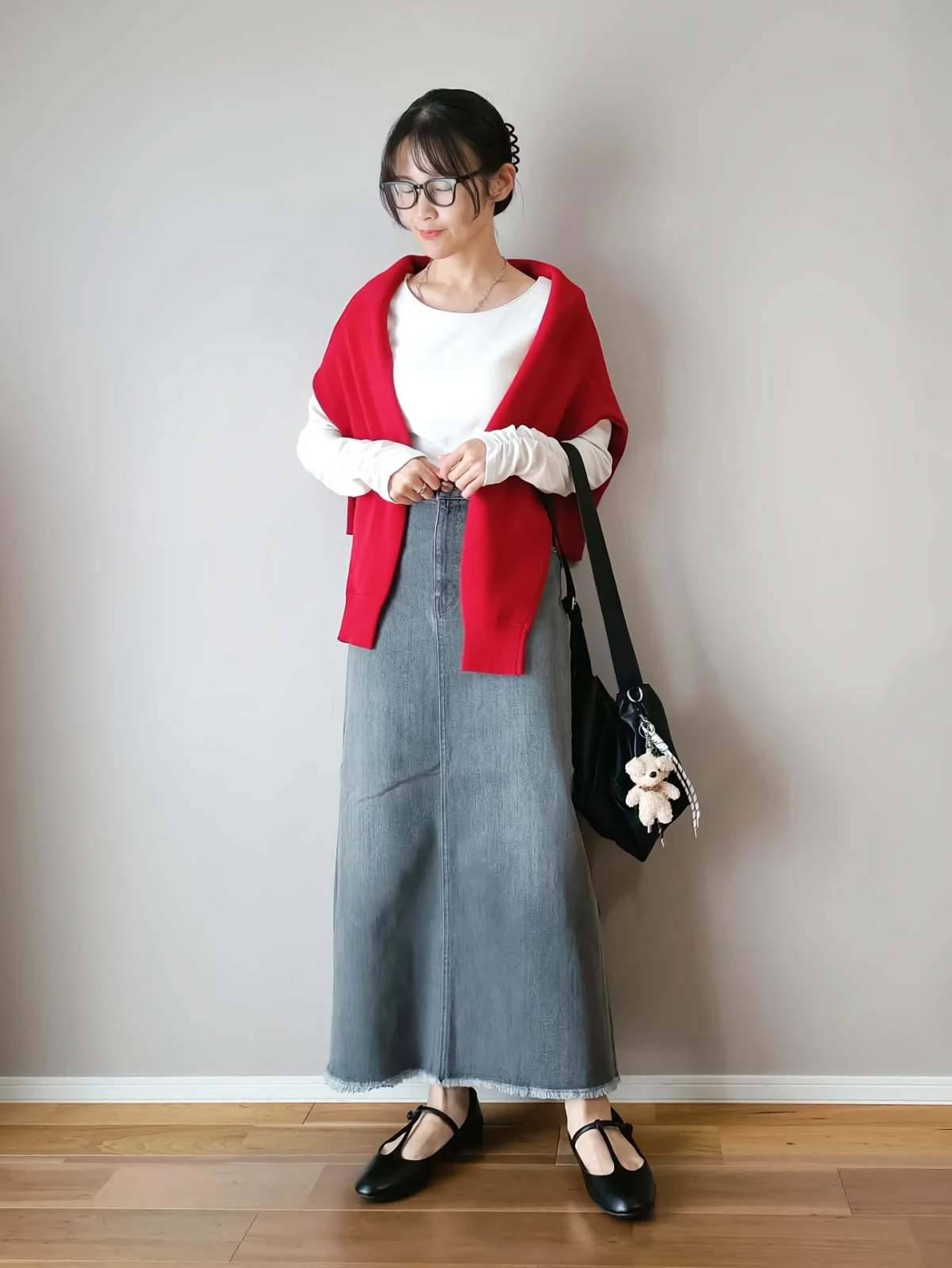 白トップスにデニムスカートを合わせて赤のカーディガンを肩掛けすれば、一気にセンスのよさがアップしますよ!