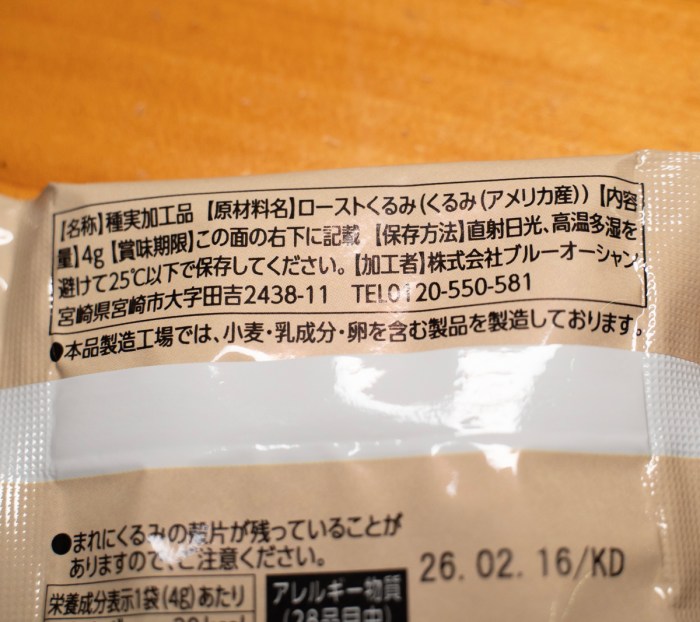 宮崎で加工されたアメリカ産ローストクルミ。パッケージのイラストがシロノワールなので、このコラボのために用意した品なのだと思われる。