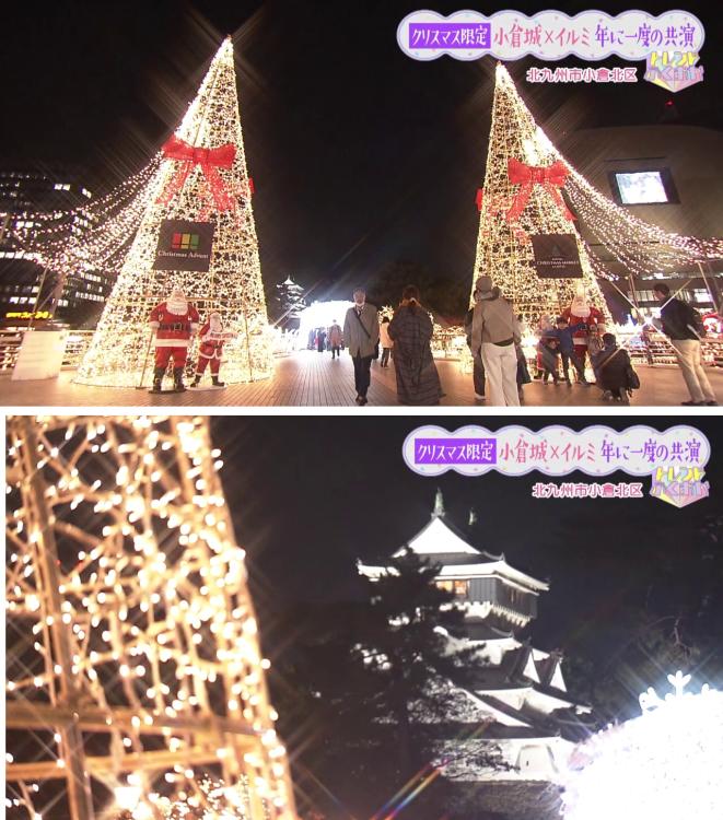 光のトンネルを抜けると、大きなクリスマスツリーとその奥にはライトアップされた小倉城がにそびえ立ちます。