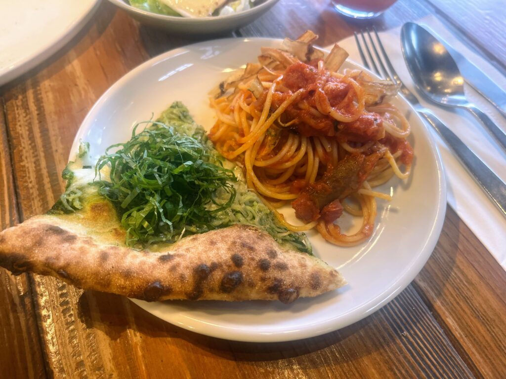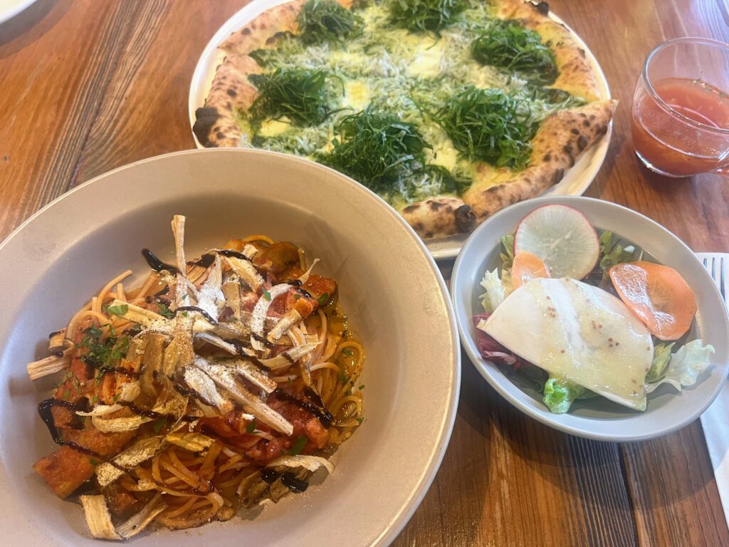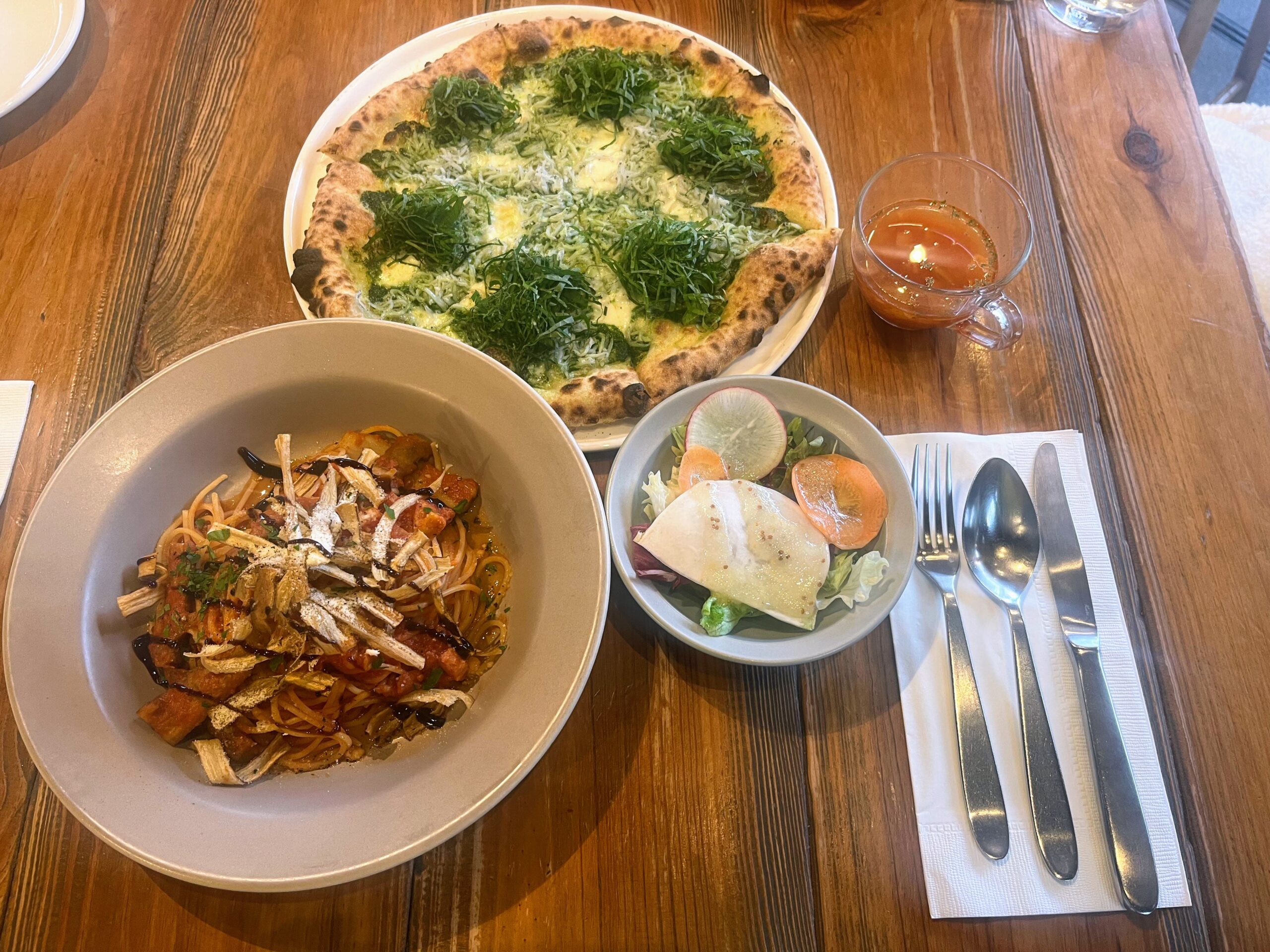 筆者は、友人と2人で伺ったので、サラダとスープ付きの「GARDEN SET」(平日限定メニュー)を注文し、パスタとピザをシェアすることにしました。