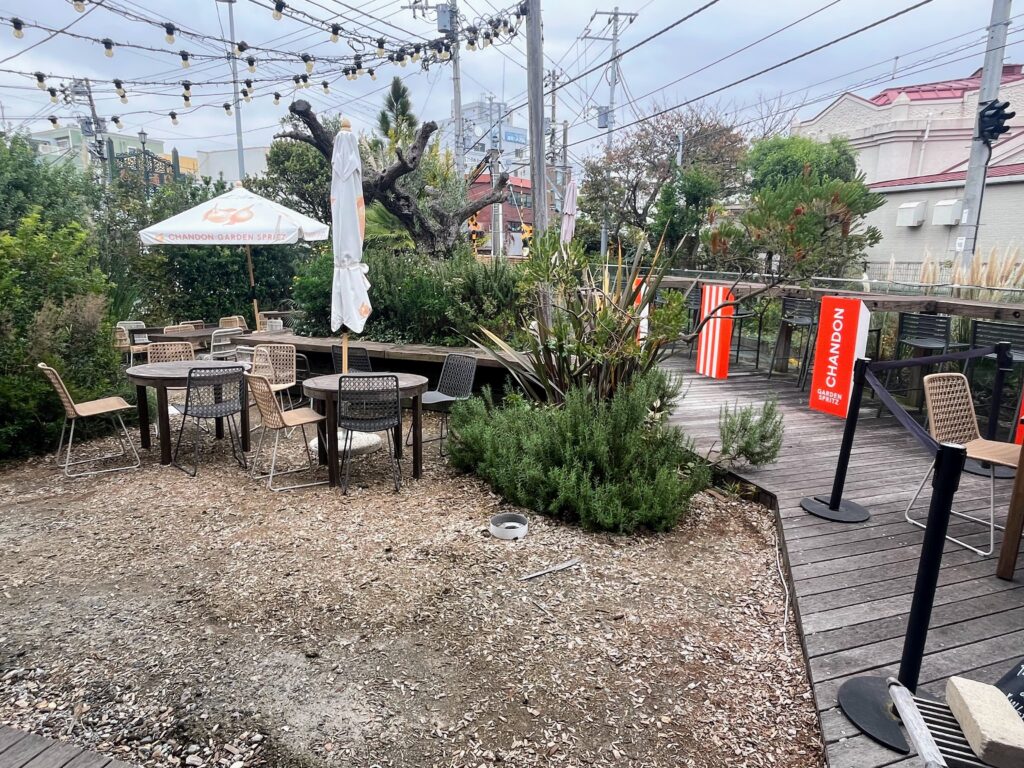 開放感あふれる広いガーデンテラスには、ゆったりと配置されたベンチやテーブルが並び、まるでお庭の中でくつろいでいるような心地よさがあります。