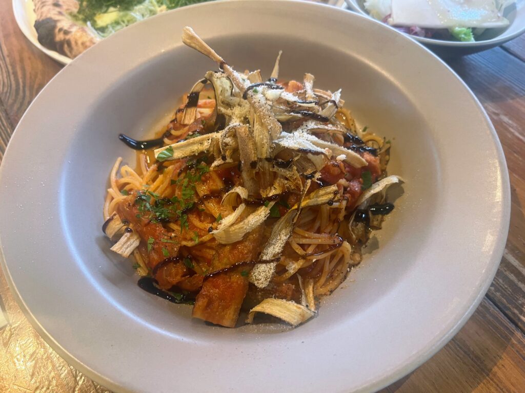 パスタは「青森県産十和田美人ごぼうと鎌倉ベーコンのアマトリチャーナ」をセレクトしました。アマトリチャーナは、イタリアでは家庭料理として親しまれているトマトベースのパスタです。