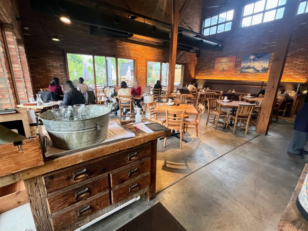 店内に足を踏み入れると、まず広々とした空間が迎えてくれます。木とレンガを基調にした温かみのある内装に、高い天井が相まって、心地よい開放感が広がっています。