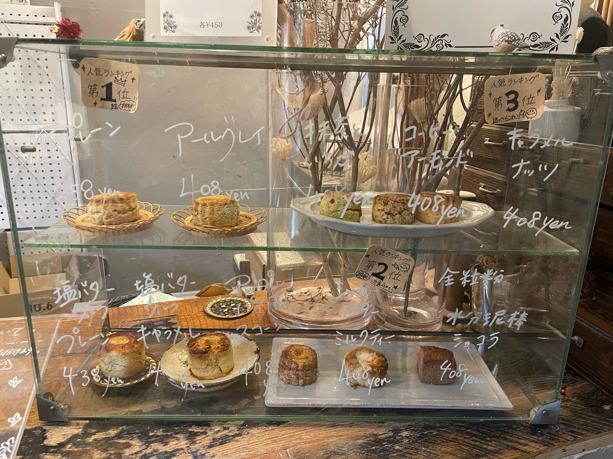 スコーンは写真のようにお洒落なディスプレイに陳列されており、すでに4個取り置き済みの筆者でしたが、追加でもう1、2個注文しようか悩んでしまいました(笑)。