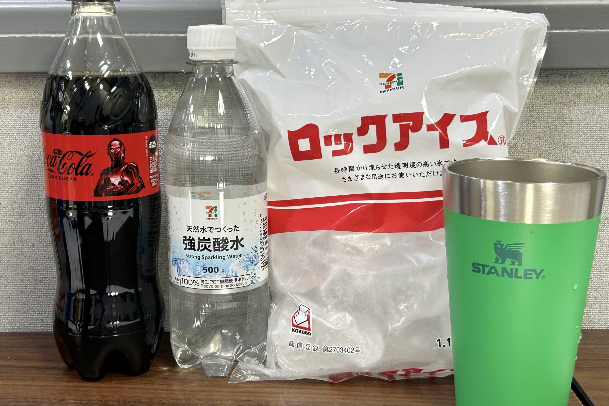 タンブラーにロックアイスを入れた状態で、コーラ7、強炭酸水3くらいの比率で割りつつ、味見をしながら調整して完成。飲みながらドリンクの割合を調整していってほしいので、初めは、カップ満杯に入れすぎないように注意!