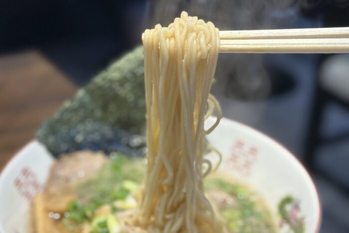 「近藤製麺」の熟成麺は、中細ストレートながらしっかりとした歯ごたえと小麦の香りを感じます。近藤製麺特有の長い麺でのど越しも良く、背脂醤油のキレのあるスープともよく合っています。