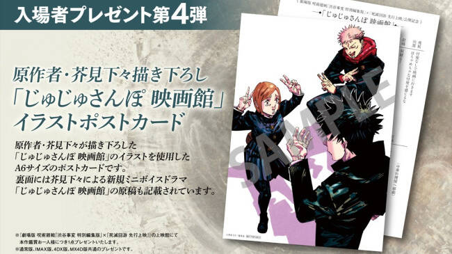 『劇場版 呪術廻戦「渋谷事変 特別編集版」×「死滅回游 先行上映」』入場者プレゼント第4弾は、【原作者・芥見下々描き下ろし「じゅじゅさんぽ 映画館」イラストポストカード】 に決定した。先日解禁されて大きな反響を呼んだ、原作者・芥見下々が描き下ろした「じゅじゅさんぽ 映画館」のイラストを使用したA6サイズのポストカードとなる。裏面には芥見下々による新規ミニボイスドラマ「じゅじゅさんぽ 映画館」の原稿も記載されており、ファン垂涎の入場者プレゼントとなっている。入場者プレゼント第4弾は、12月6日(土)より配布開始となる。