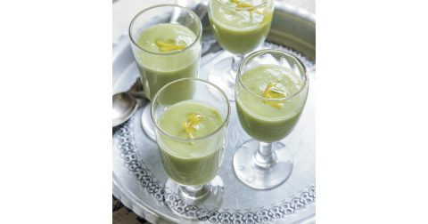 栄養価の高いアボカドを、ヨーグルト風味のなめらかな冷製スープに。ガラスの器に盛ると、涼やかな雰囲気を演出できます。