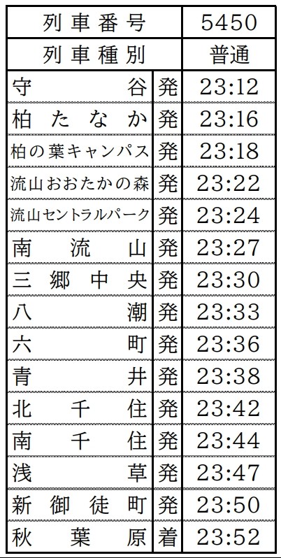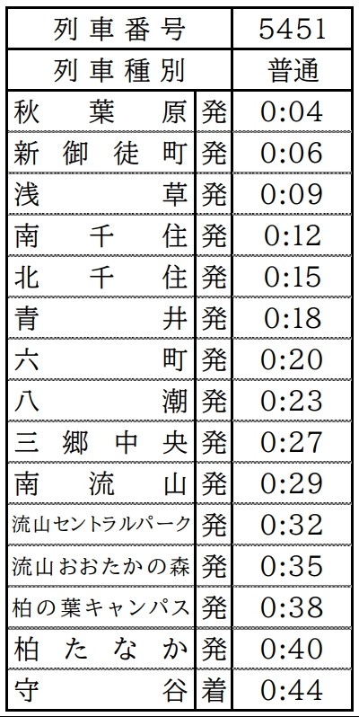 秋葉原 0:04発⇒北千住 0:15発⇒南流山 0:29発⇒流山おおたかの森 0:35発⇒守谷 0:44着