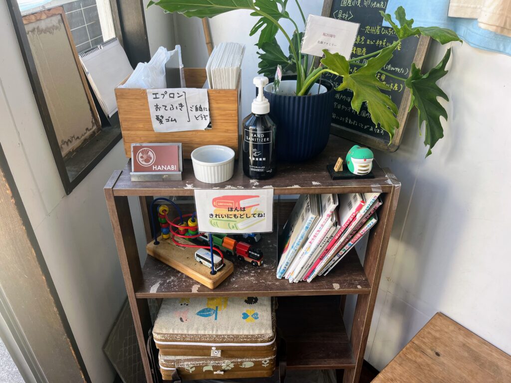 店内入ってすぐの棚には、子ども用のおもちゃや絵本だけでなく、大人用にも髪ゴムやエプロン、さらにひざ掛けまで自由に使えるように設置されていました。
