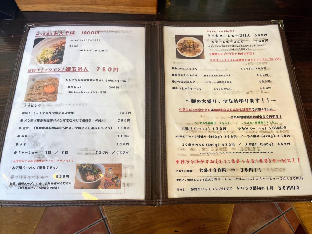 麺は大盛りや少なめも選べたり、平日のランチタイムサービスがあるので、しっかりメニューの片隅まで見てみてくださいね。