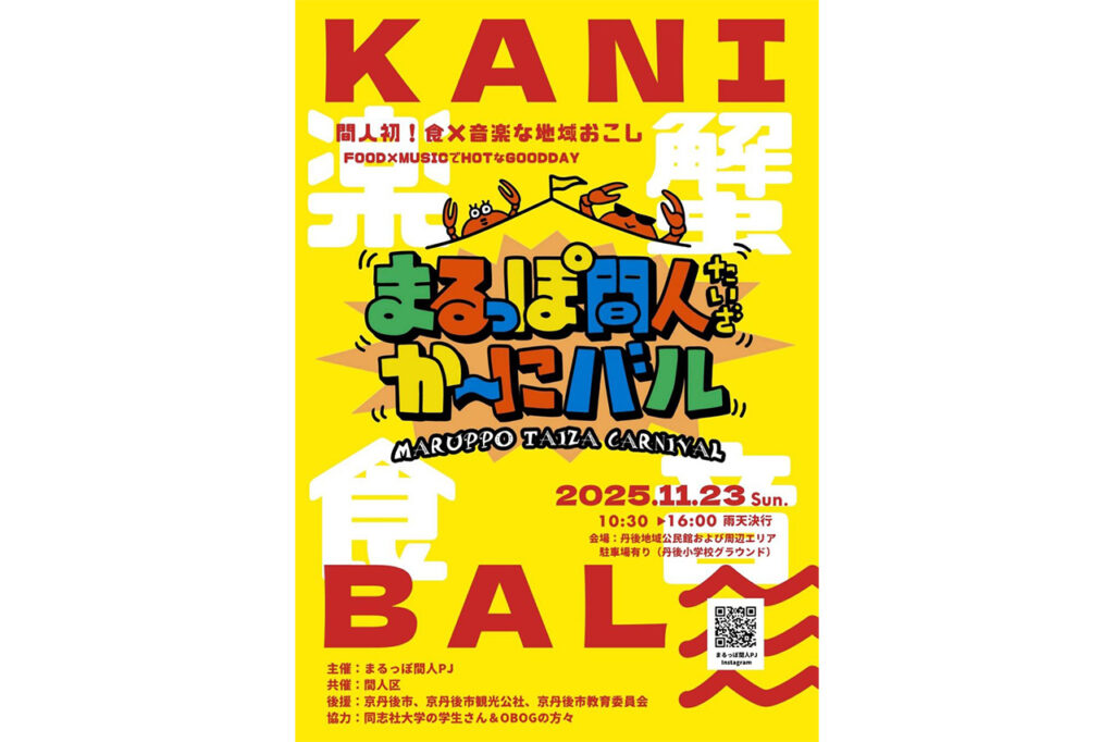 2025年11月23日(日)に、間人初となる“食×音楽”の地域おこしイベント『まるっぽ間人(たいざ)か~にバル』が[丹後地域公民館](京都府京丹後市)とその周辺エリアで開催される。間人のグルメが集結する他、ジャズ演奏や、バラエティ溢れる体験コーナーなど、子どもも大人も楽しめる企画が盛りだくさん。