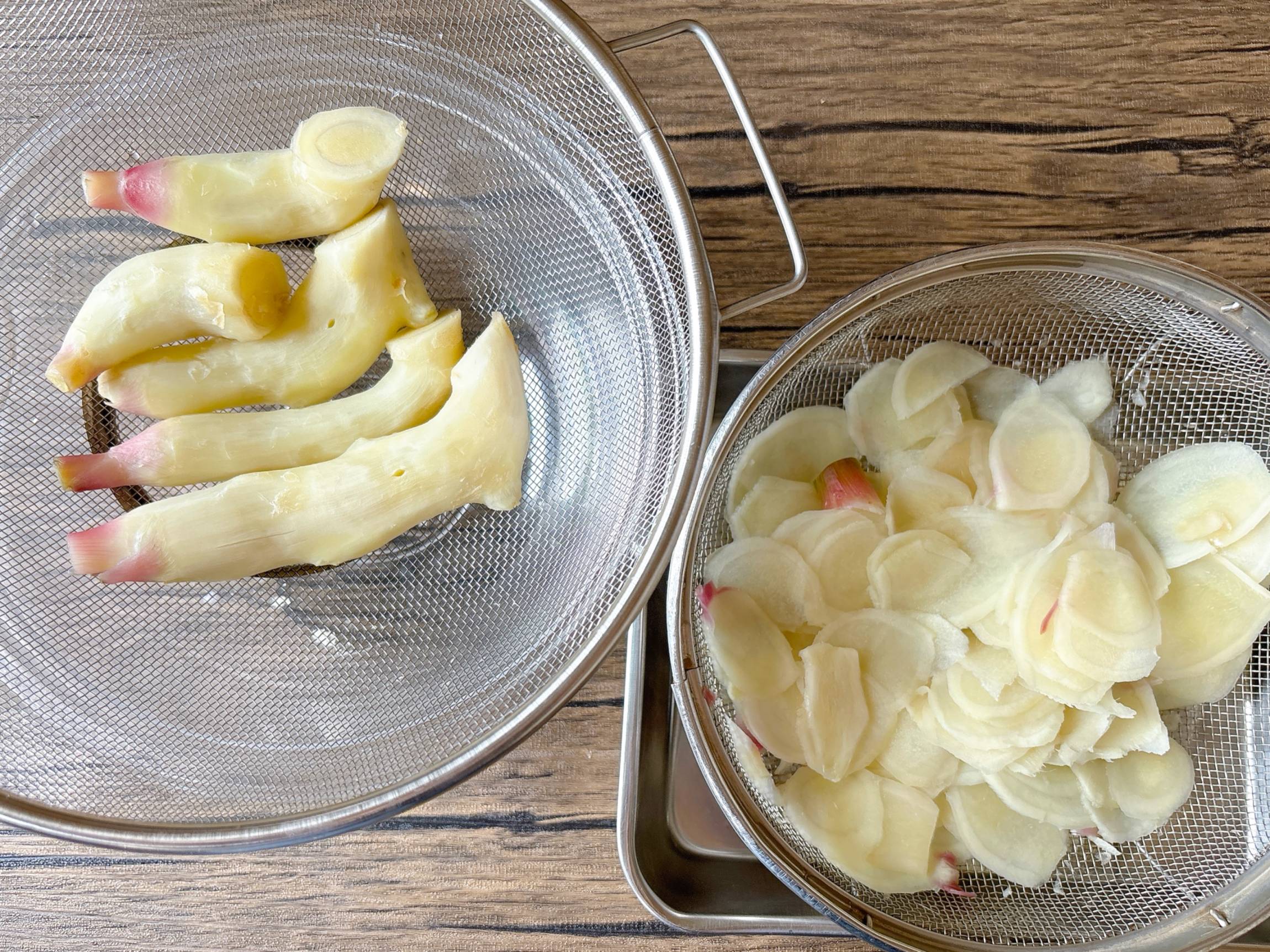 同じ鍋でスライスした新生姜をゆでます。1分ほどしたらザルにあげておきます。