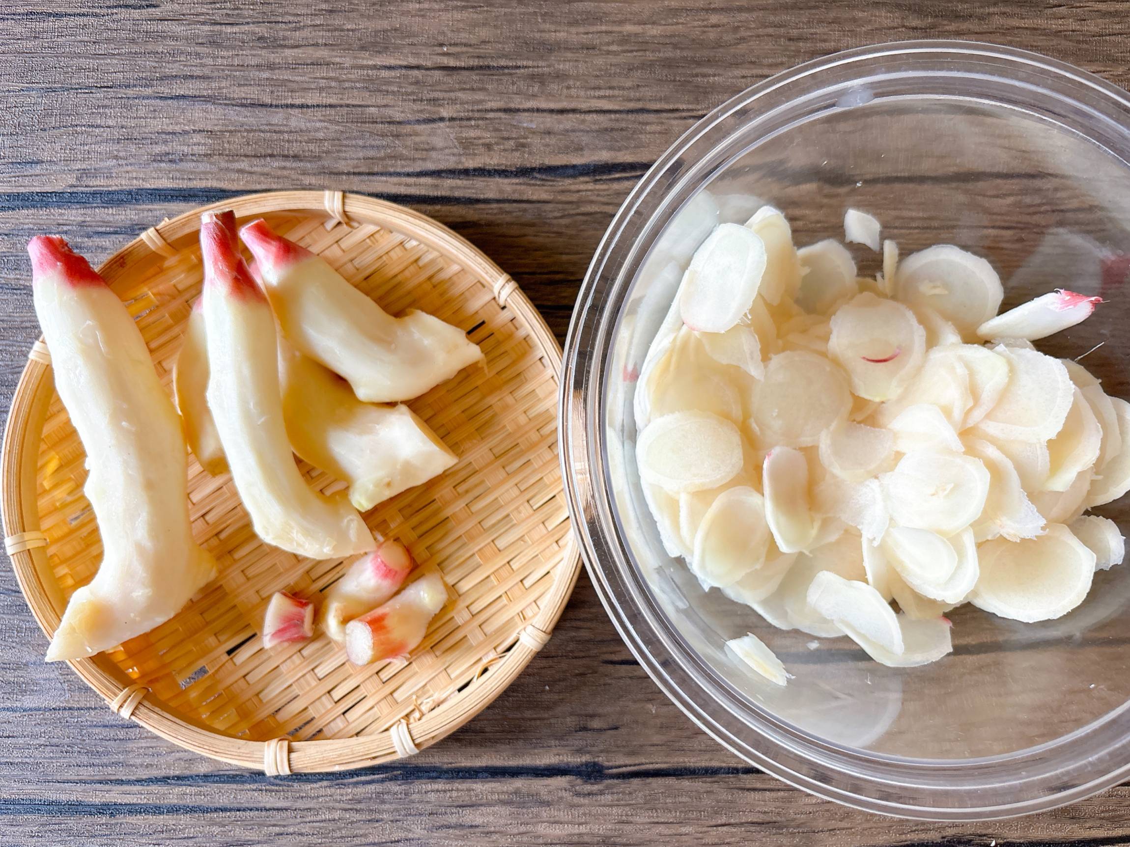 新芽の部分は大きいままで、根元の部分は包丁かスライサーを使って薄切りにします。新生姜の茎の紅色の部分は、一緒に漬け込むときれいなピンク色に仕上がるので、とっておきます。