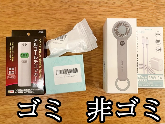 以上を踏まえ、全5点をゴミかゴミじゃないかで仕分けしてみた。ハンディファンと充電器については温情的に非ゴミと評価したが、福袋トータルで考えるとまごうことなくゴミである。