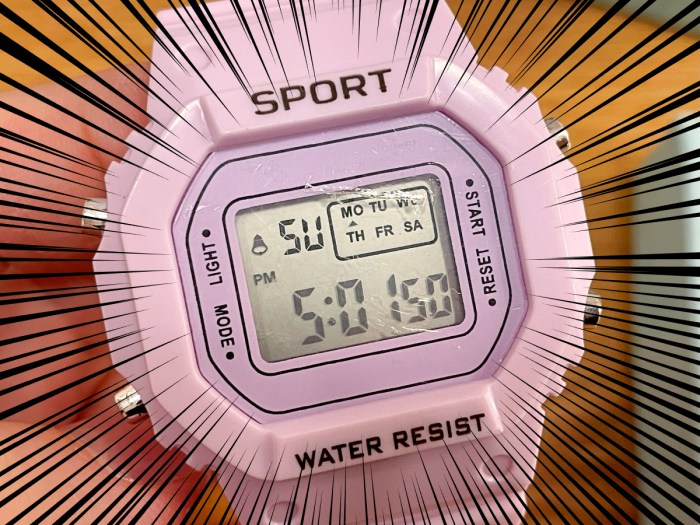 そしてラストを飾るのは、やはり中国製と思われる子供用の腕時計。これもいらんなぁ。と取り出してみて気づいたのだが、コイツ……すでに動いてやがる! 時を刻んでやがるぞ!!