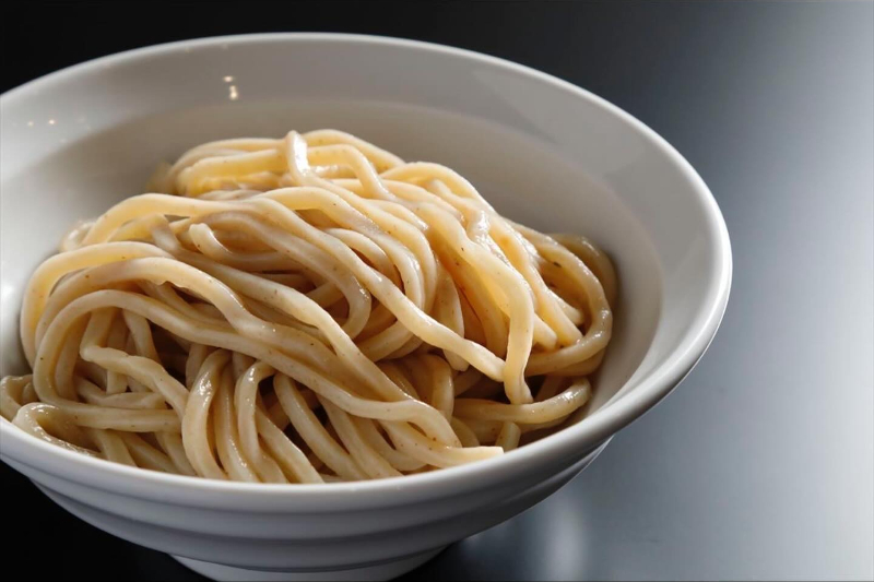 この店の特徴は、北海道産小麦など数種類をブレンドし、石臼挽きの全粒粉にした特注の極太麺。うどんのような迫力ある太さと、噛むほどに広がる豊かな風味が魅力です。