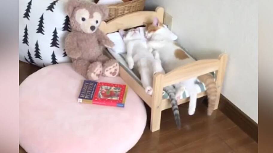 この日、飼い主さんがふとこたつの方に目をやると、ねるちゃんがこたつの「中」ではなく、こたつの「上」で寝そべっていたのだそうです。「猫はこたつで丸くなる」という童謡の一節を見事なまでに裏切ってくれたねるちゃんは、両手両足をびよーんと伸ばし、おなかを完全に開放した状態でくつろいでいたのだとか。