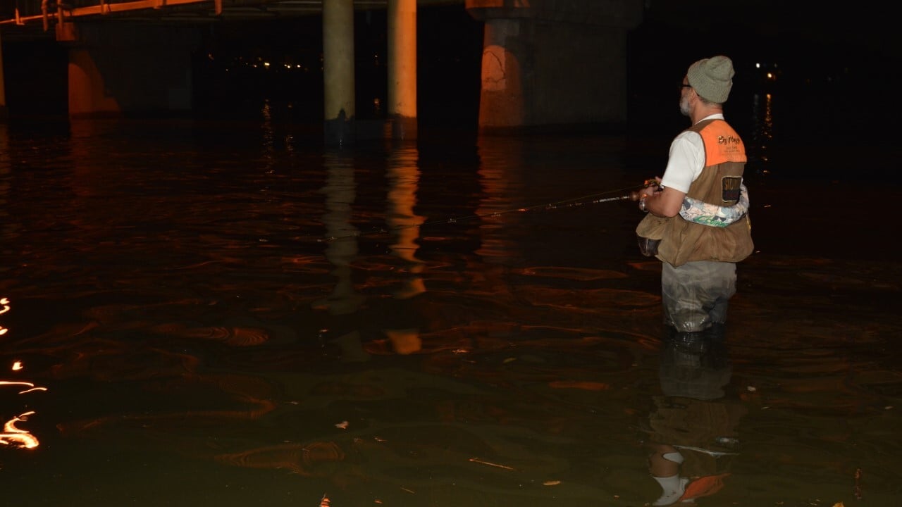 シンペンやリップレスミノーをローテーションしながら橋の下の明暗をねらう。まずは左岸から、次に右岸から。右岸からK-TENブルーオーシャンのリップレスミノーをドリフトさせて橋脚際をタイトに通したタイミングでバイトらしき感触があったが……。