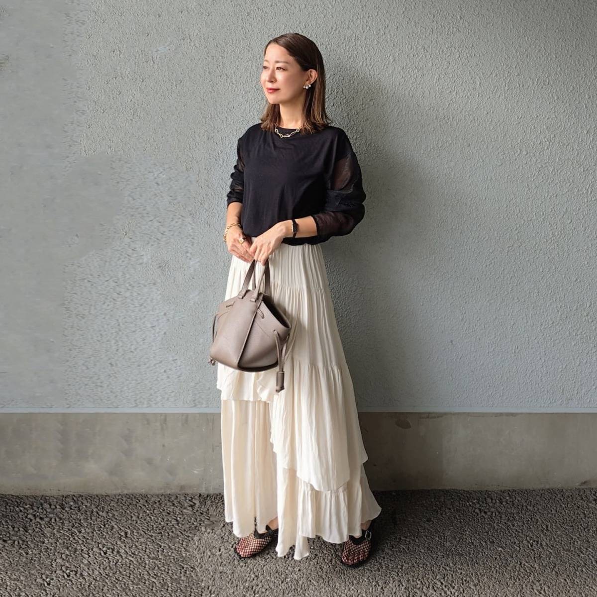 ティアードスカートを合わせれば、甘すぎず大人可愛さをプラスできて、センスのよさをアピールできますよ♡